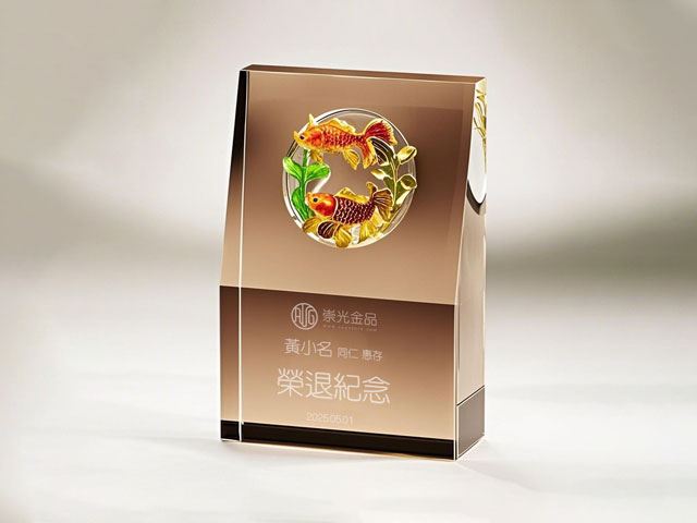 魚躍琉璃茶色水晶獎座