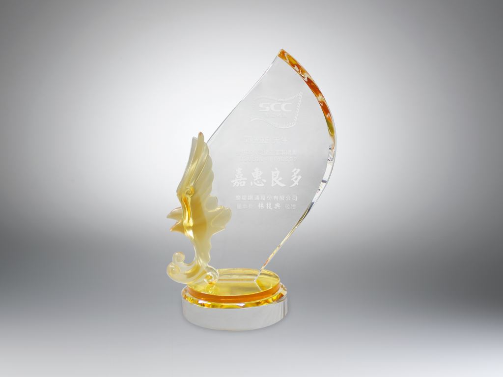而水晶的剔透展現企業精神的堅定與遠見,金黃色琉璃則承載榮耀與感謝,