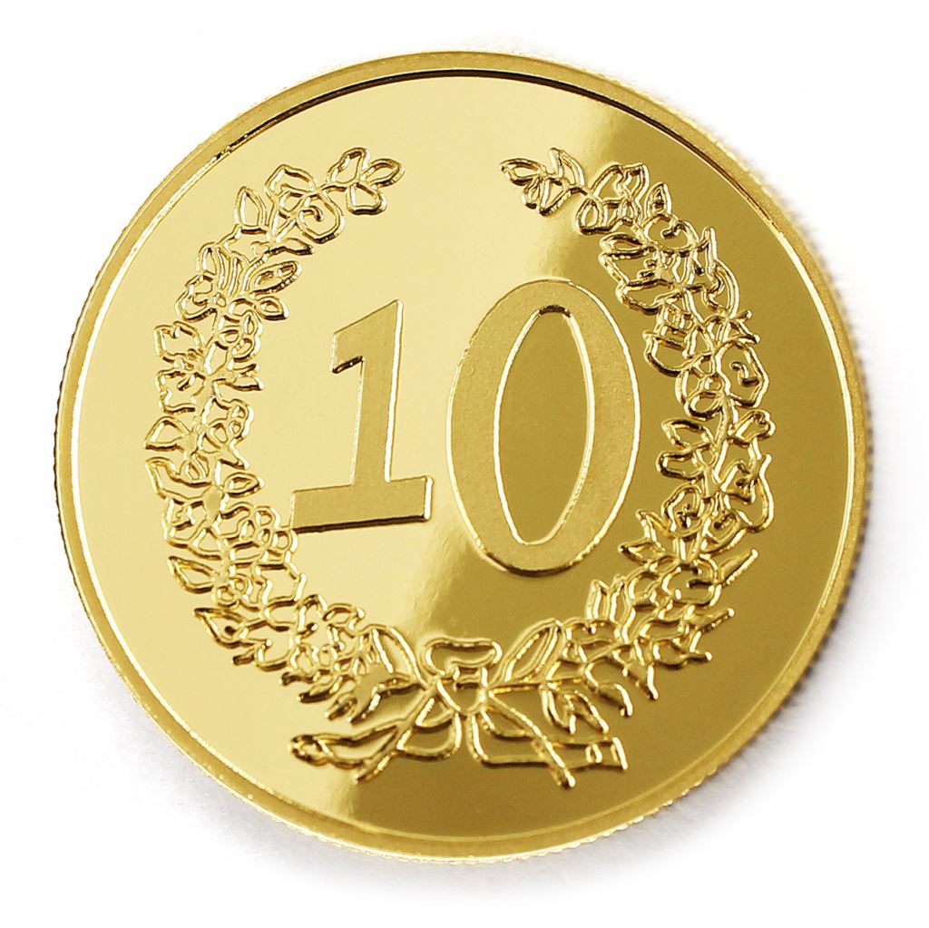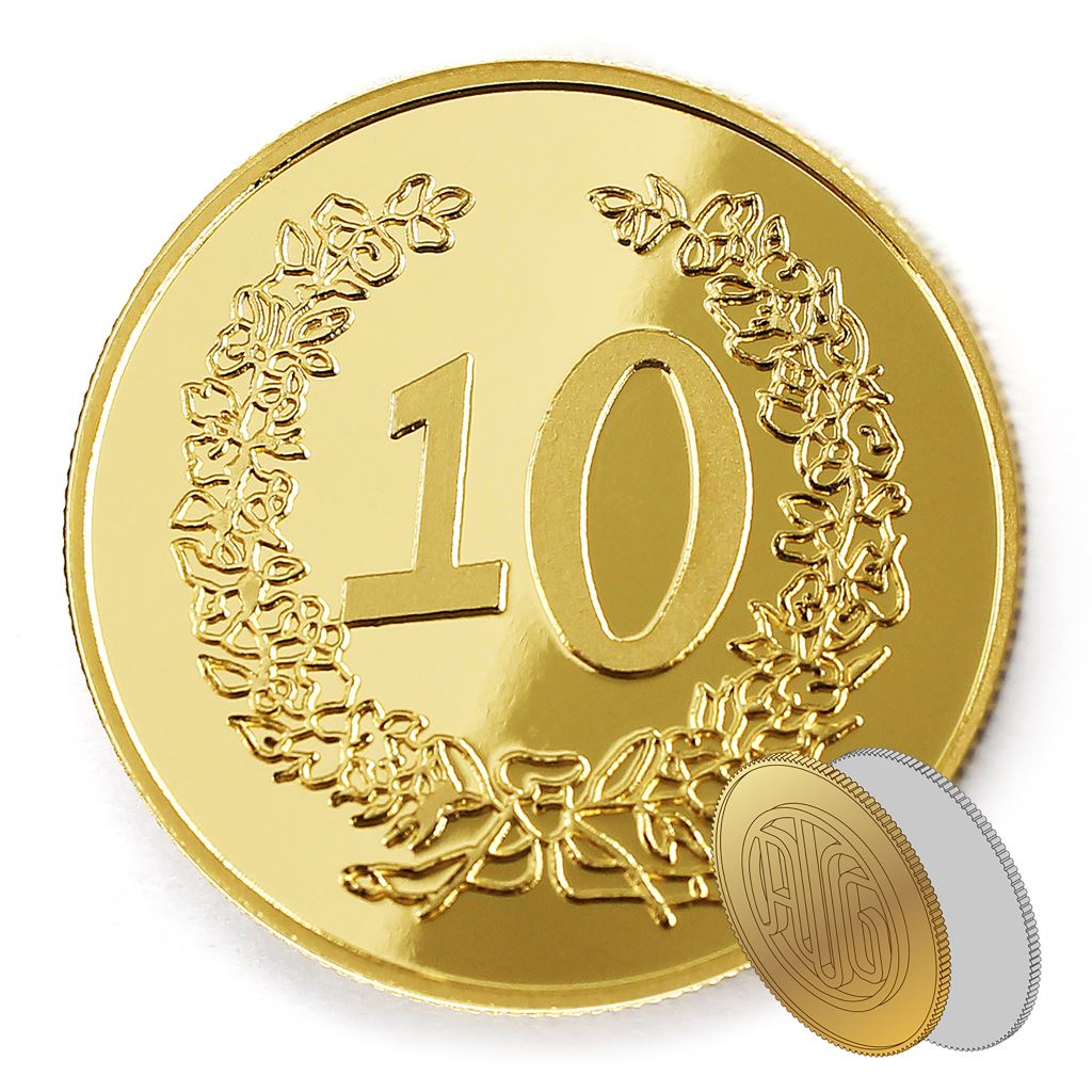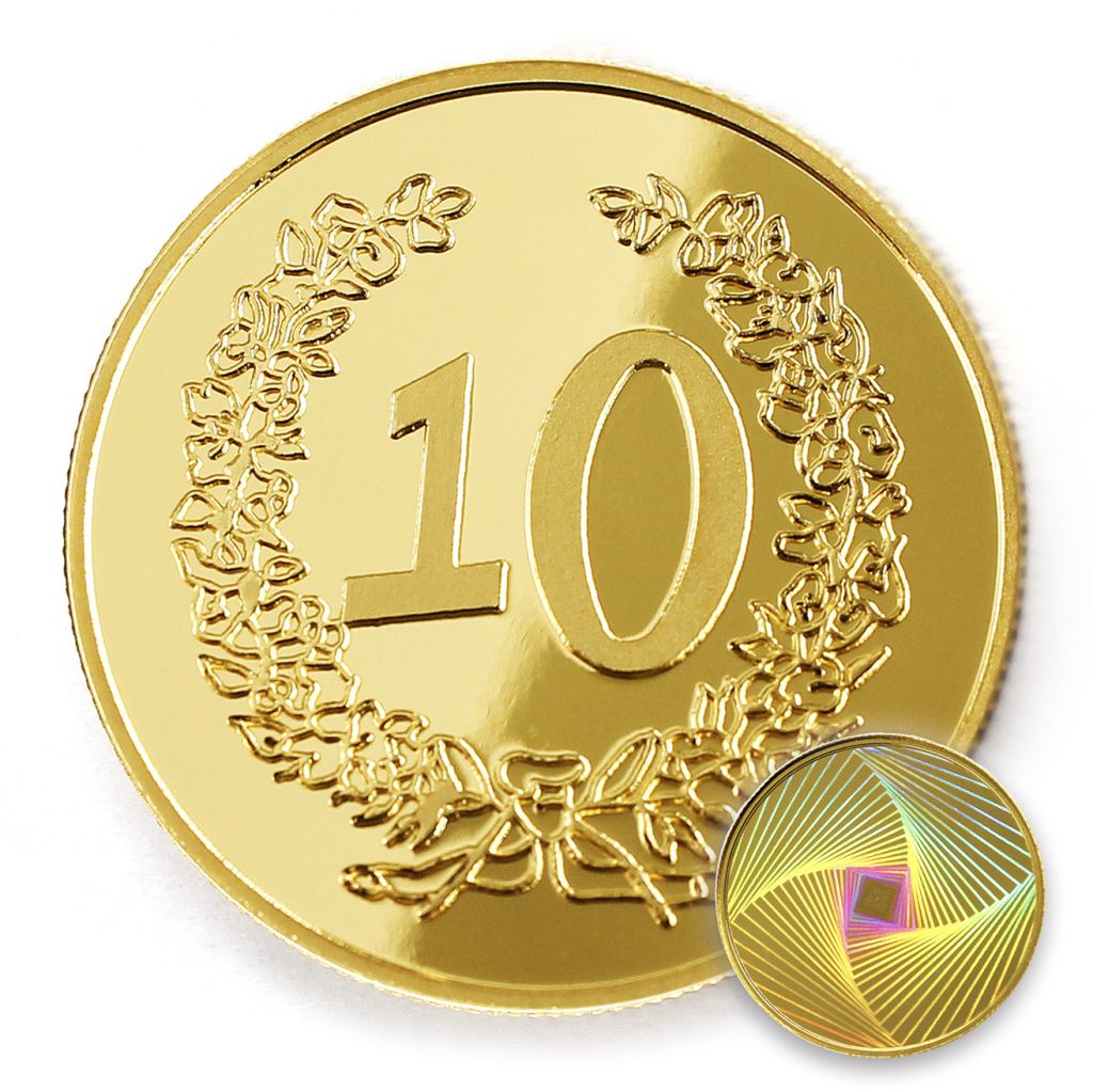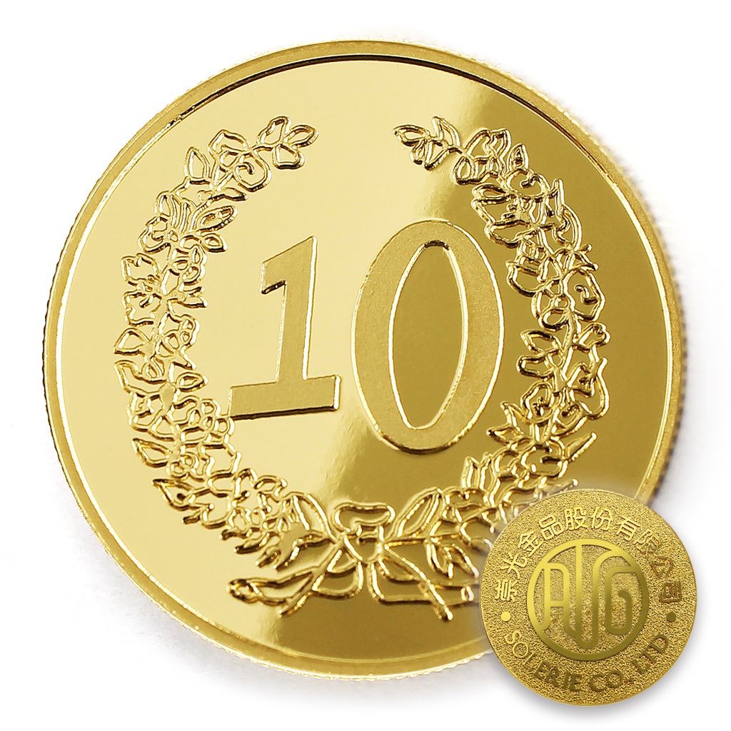 正面為金幣年資10花邊圖樣,背面為銅鍍金材質鏡面客製化CNC雕刻