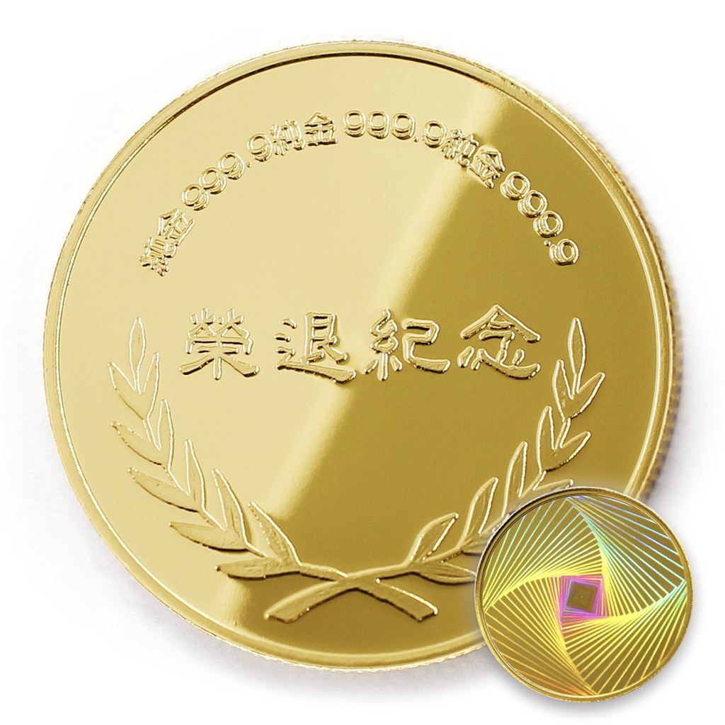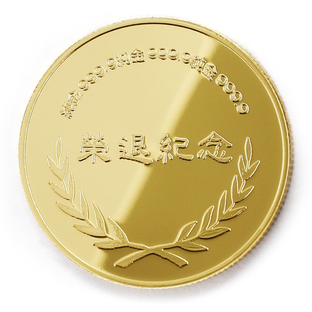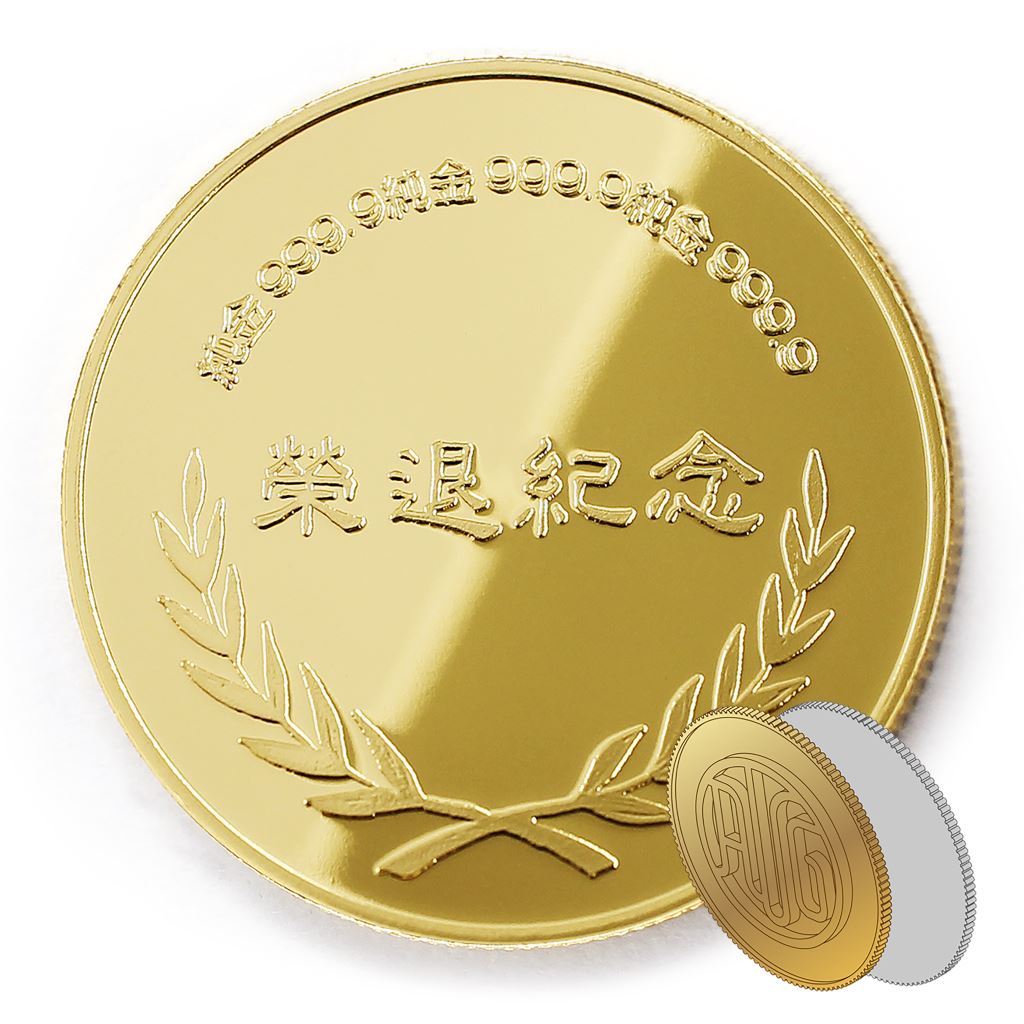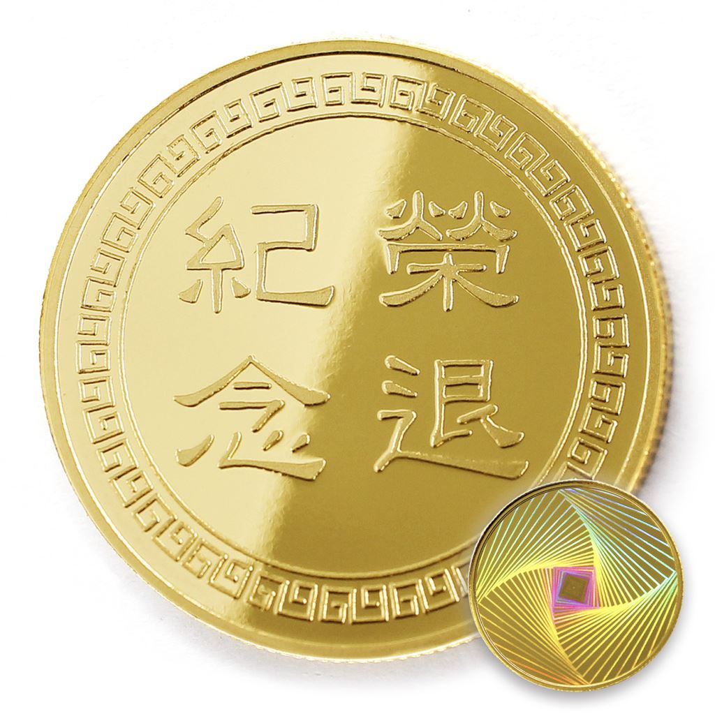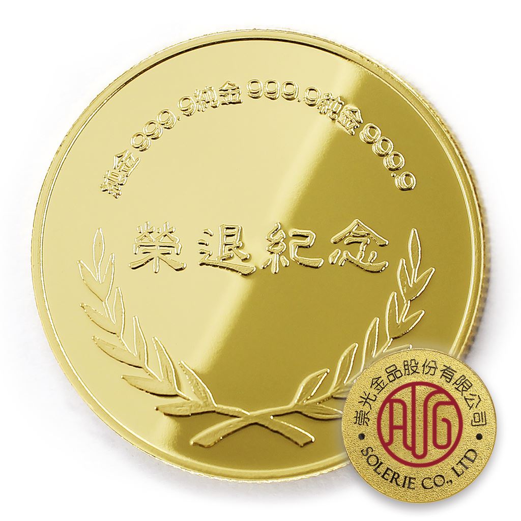 正面為金幣榮退桂冠圖樣,背面為銅鍍金材質鏡面客製化CNC雕刻