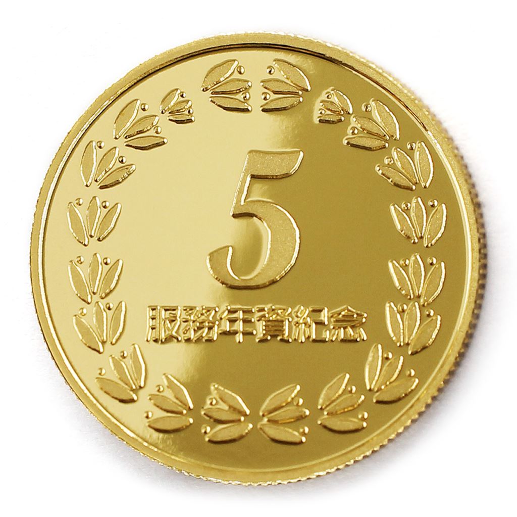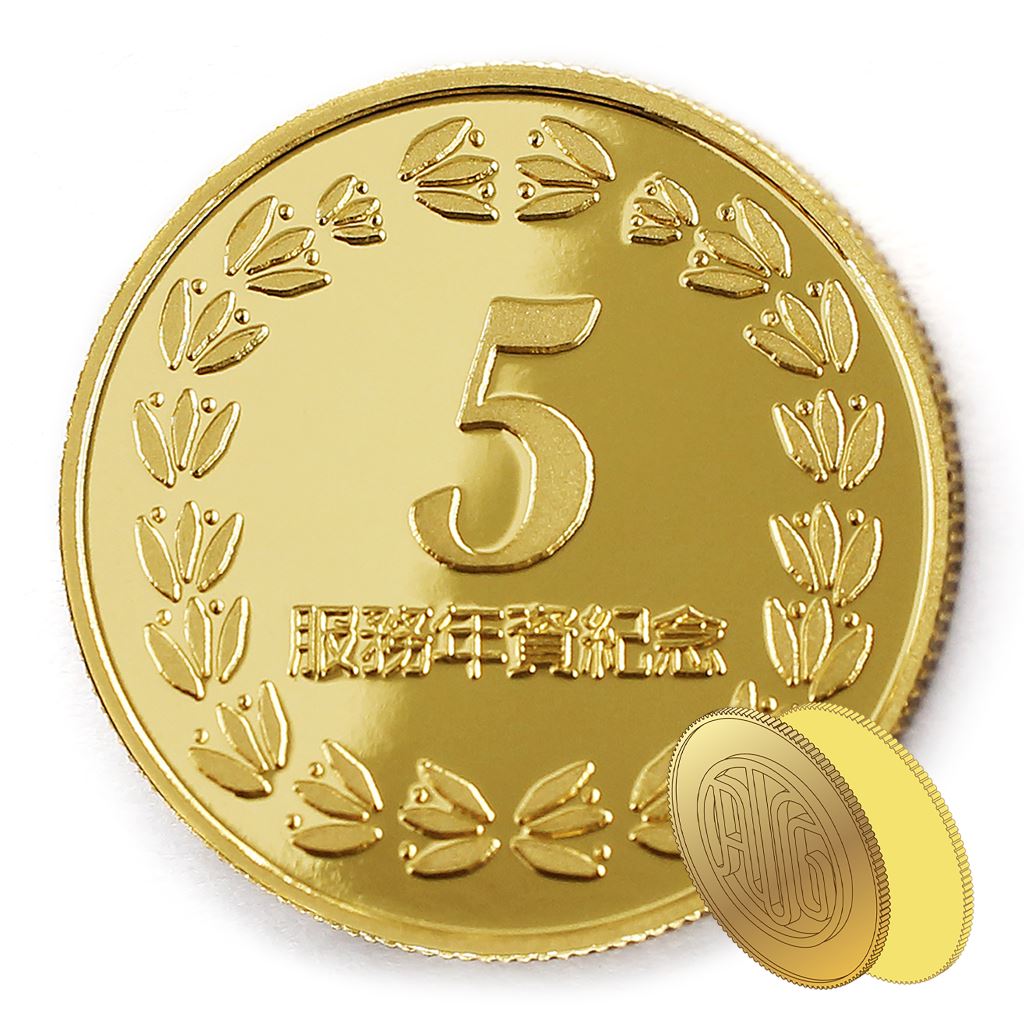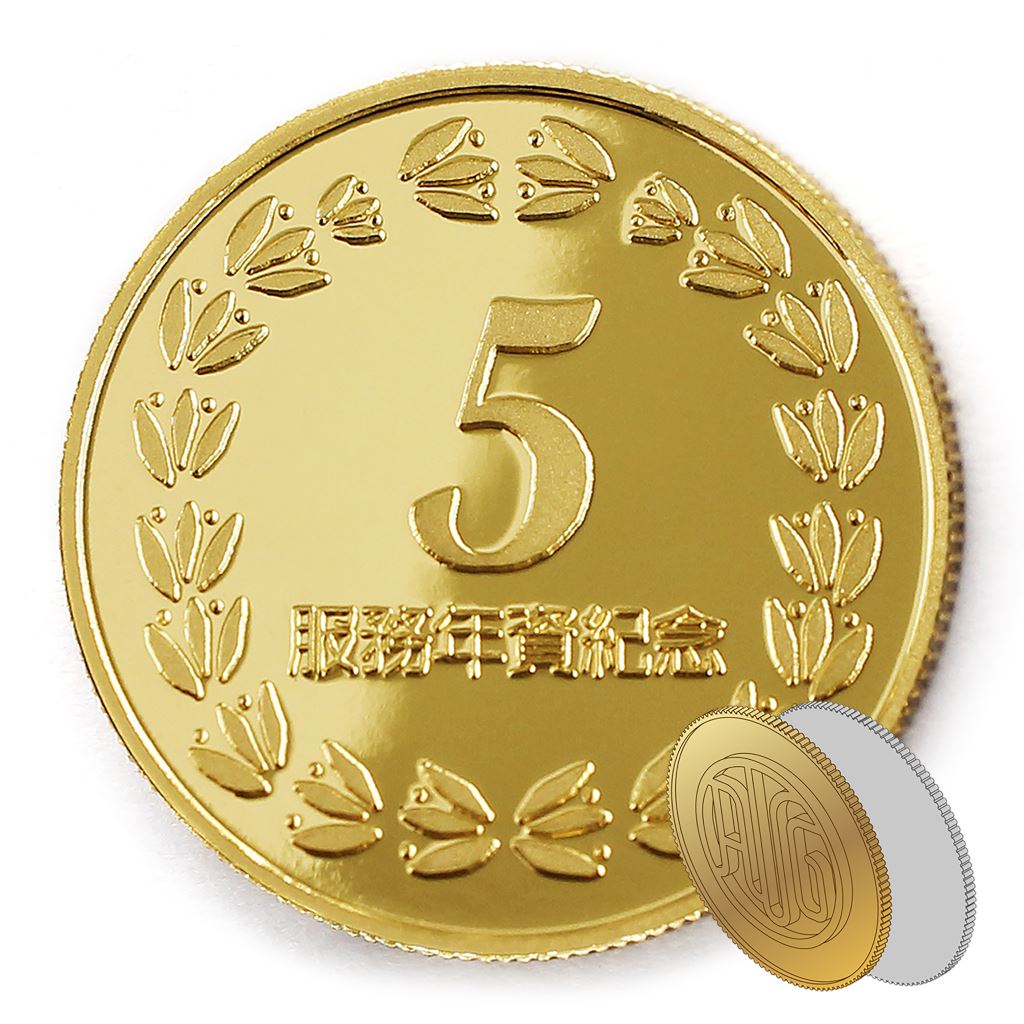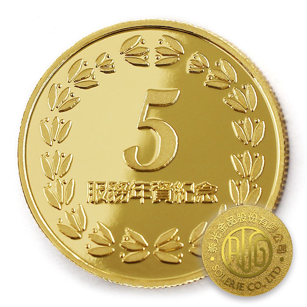 正面為金幣年資5桂環圖樣,背面為銅鍍金材質鏡面客製化CNC雕刻