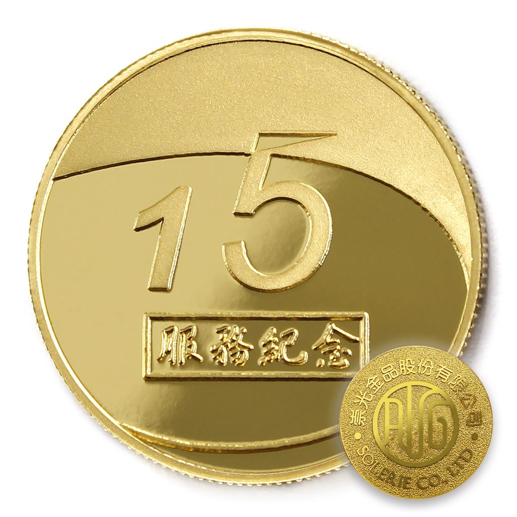 正面為金幣年資15融合圖樣,背面為銅鍍金材質鏡面客製化CNC雕刻