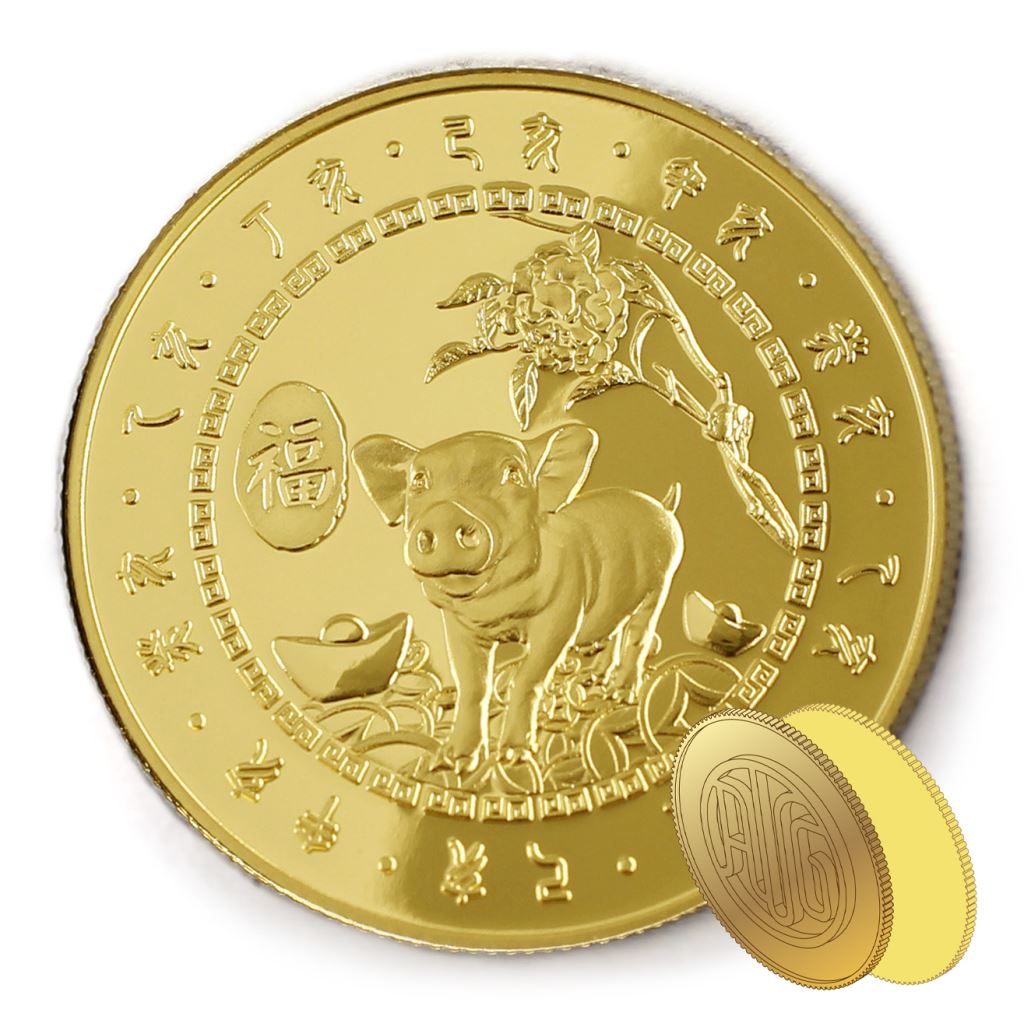 正面為豬年生肖圖樣,背面貼覆客製化金箔