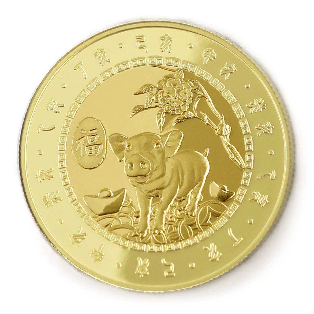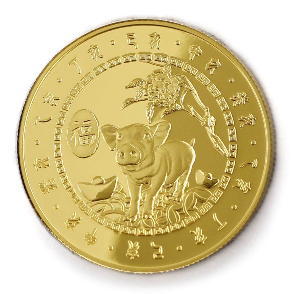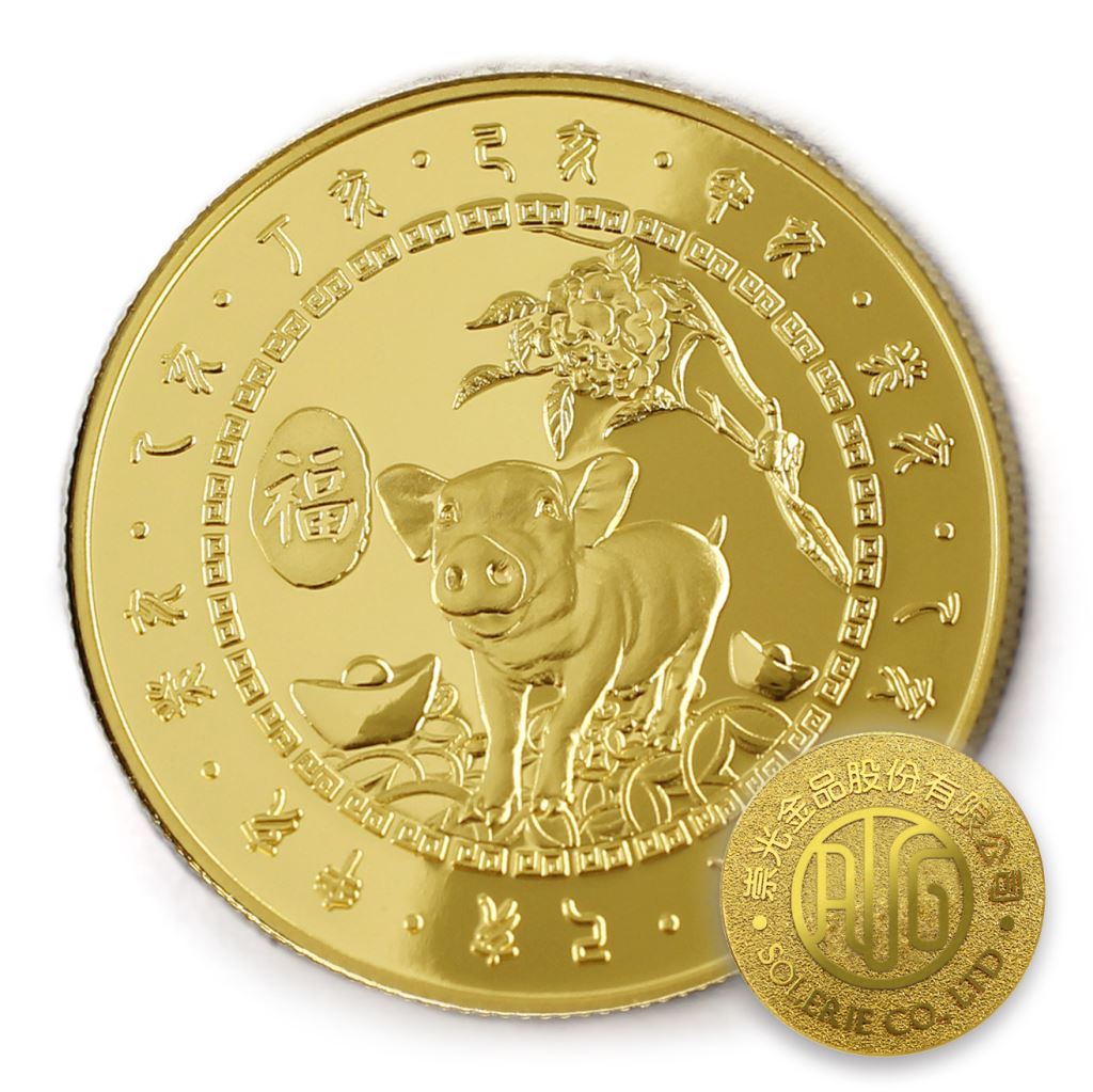中央為金幣豬年生肖圖樣,外圍與背面為銅鍍金的材質,背面鏡面客製化CNC雕刻