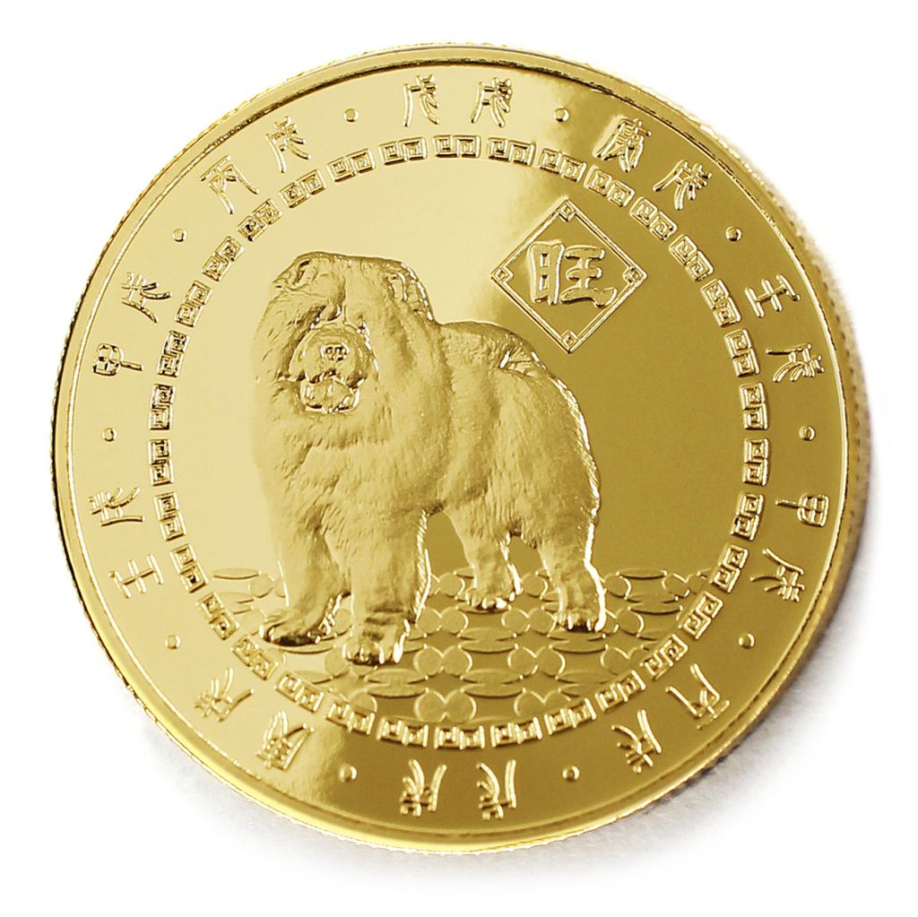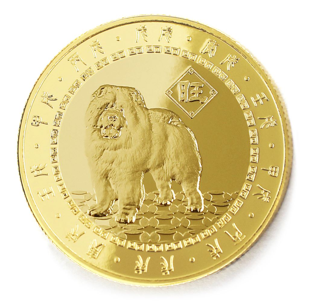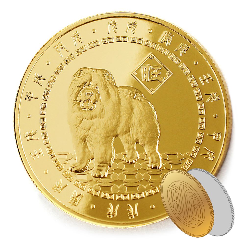 中央為金幣狗年生肖圖樣,外圍與背面為銅鍍金的材質,背面鏡面客製化CNC雕刻