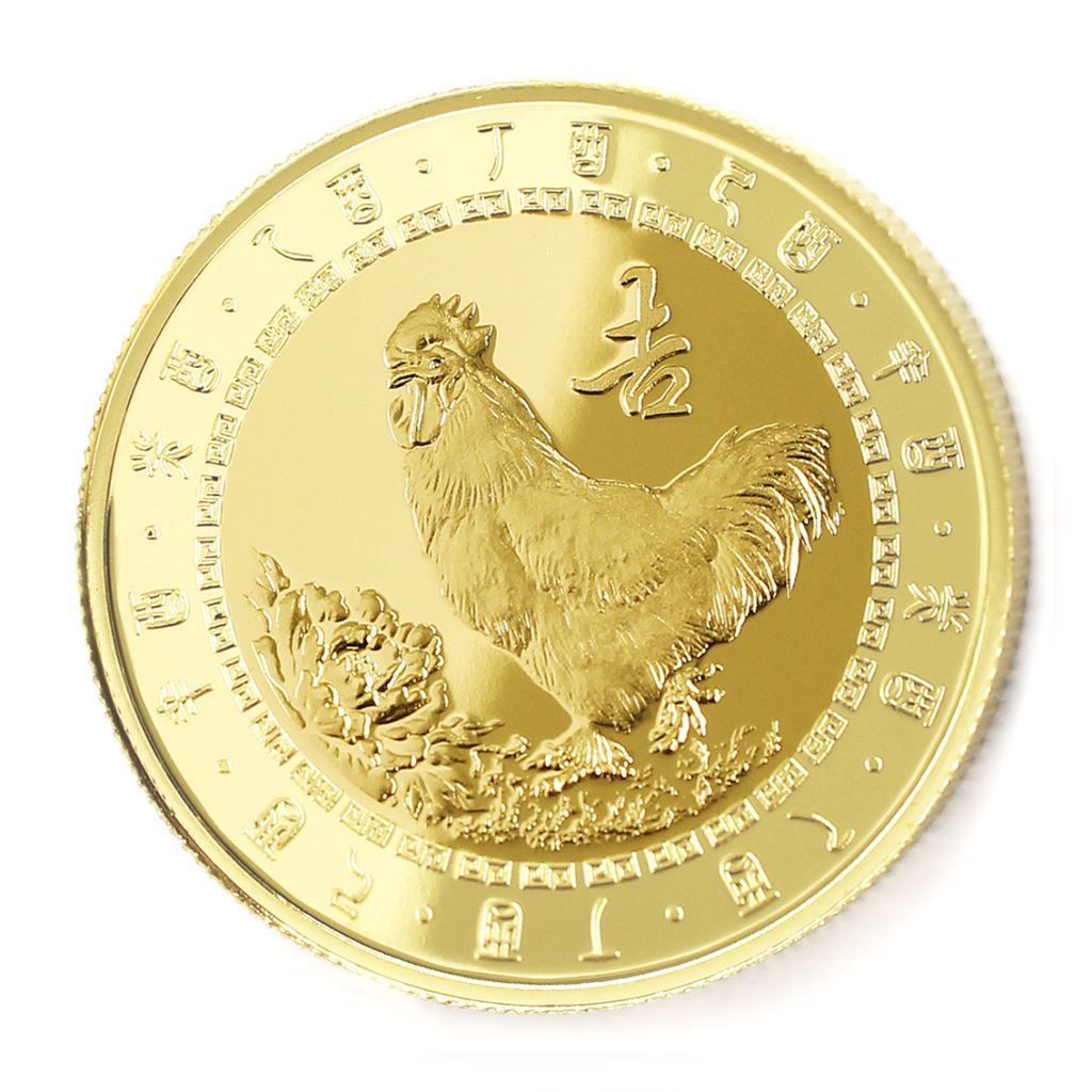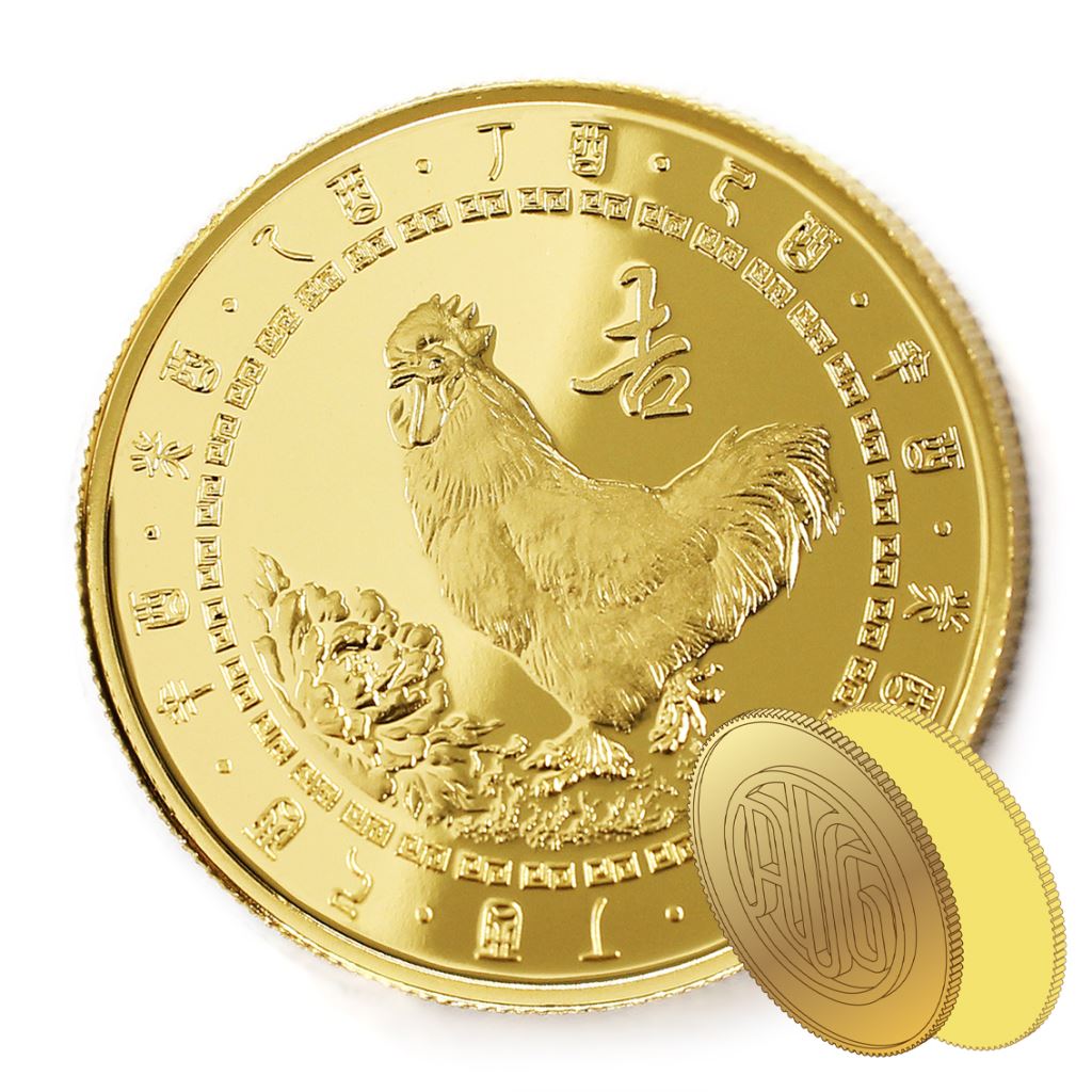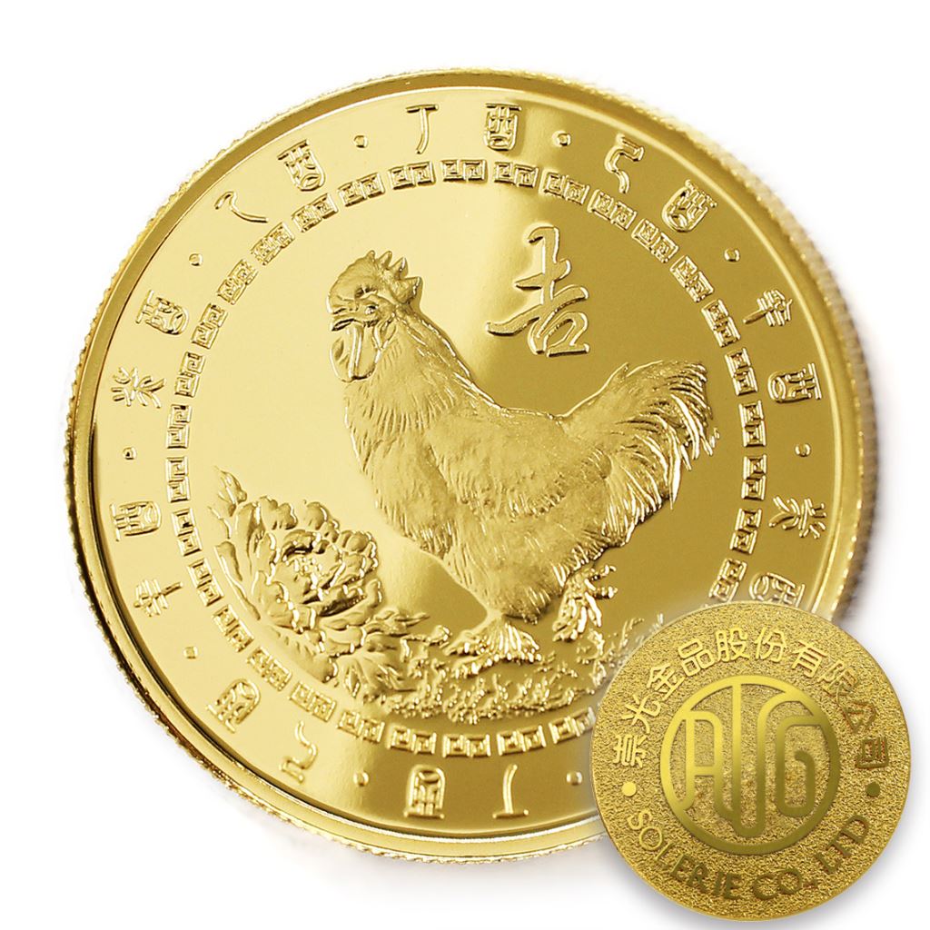 中央為金幣雞年生肖圖樣,外圍與背面為銅鍍金的材質,背面鏡面客製化CNC雕刻