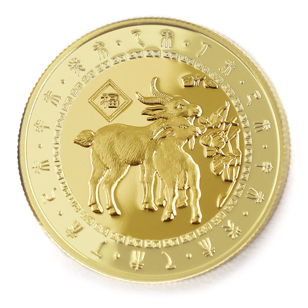 中央為金幣羊年生肖圖樣,外圍與背面為銅鍍金的材質,背面鏡面客製化CNC雕刻