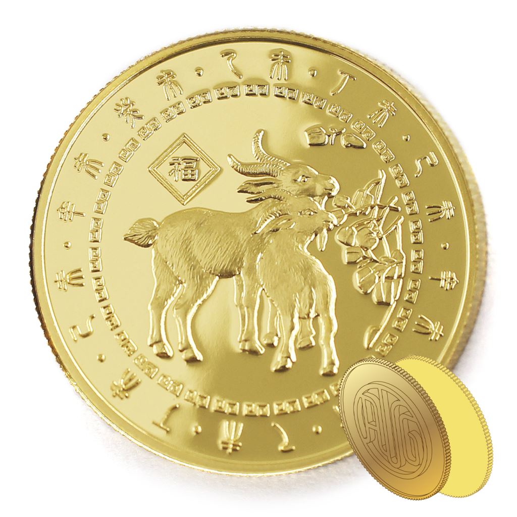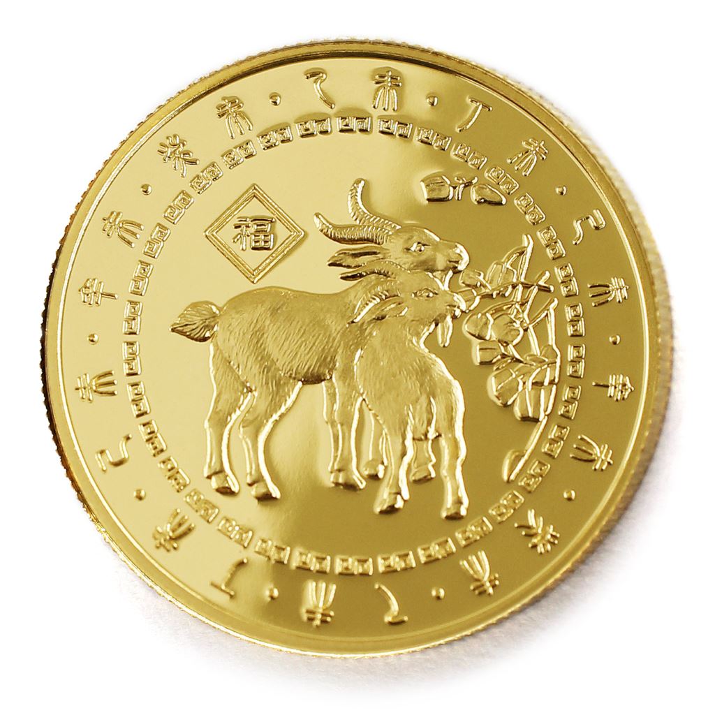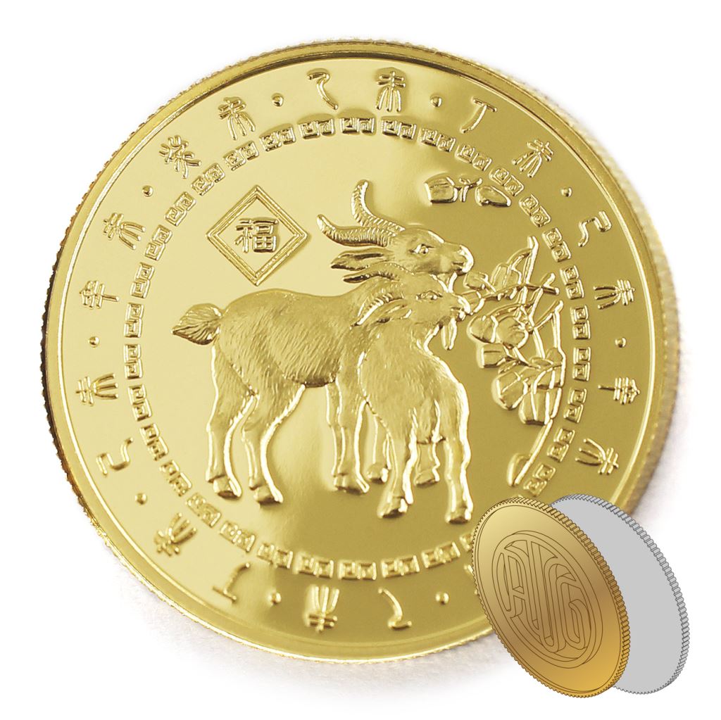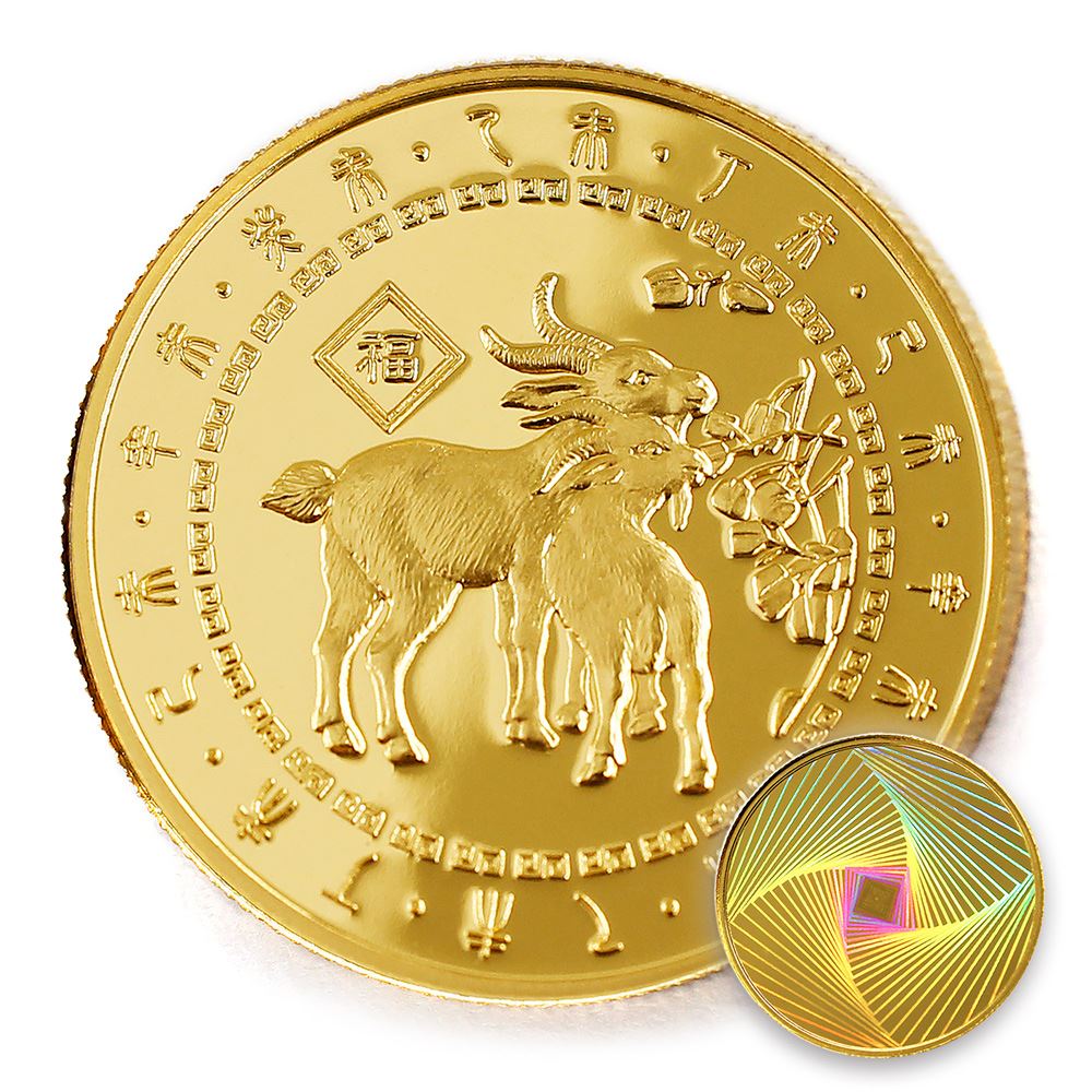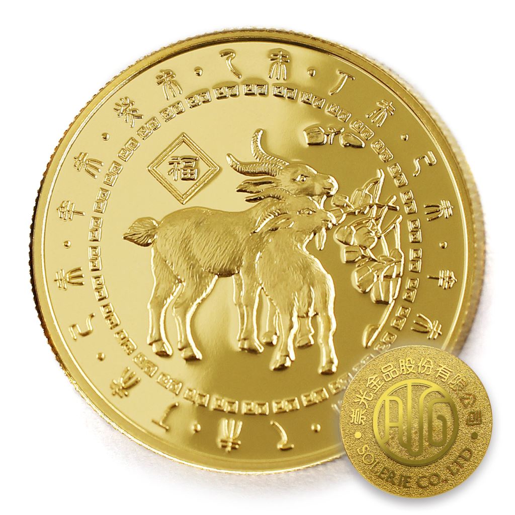 中央為金幣羊年生肖圖樣,外圍與背面為銅鍍金的材質,背面鏡面客製化CNC雕刻