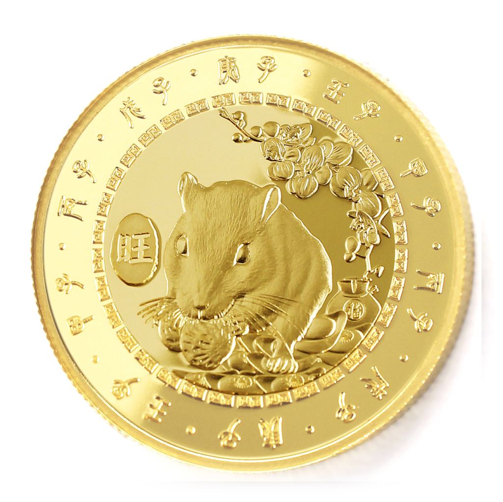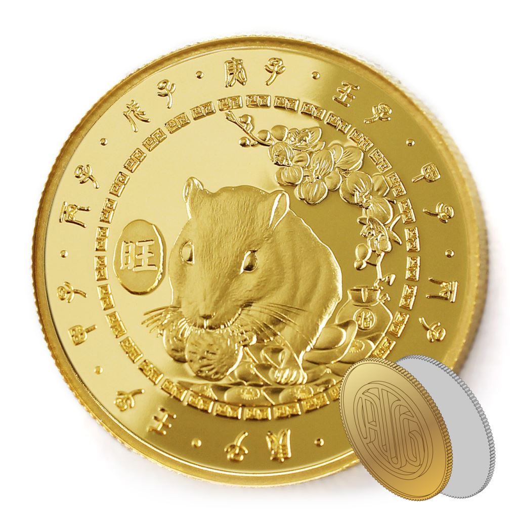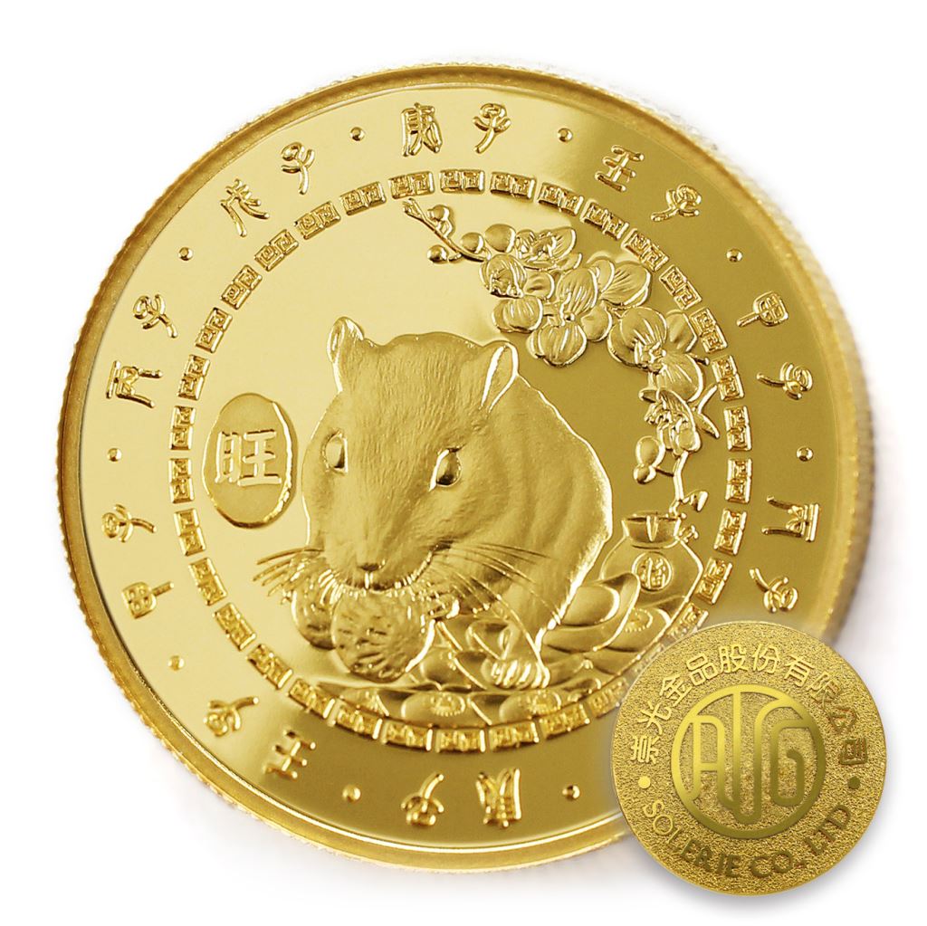 中央為金幣鼠年生肖圖樣,外圍與背面為銅鍍金的材質,背面鏡面客製化CNC雕刻