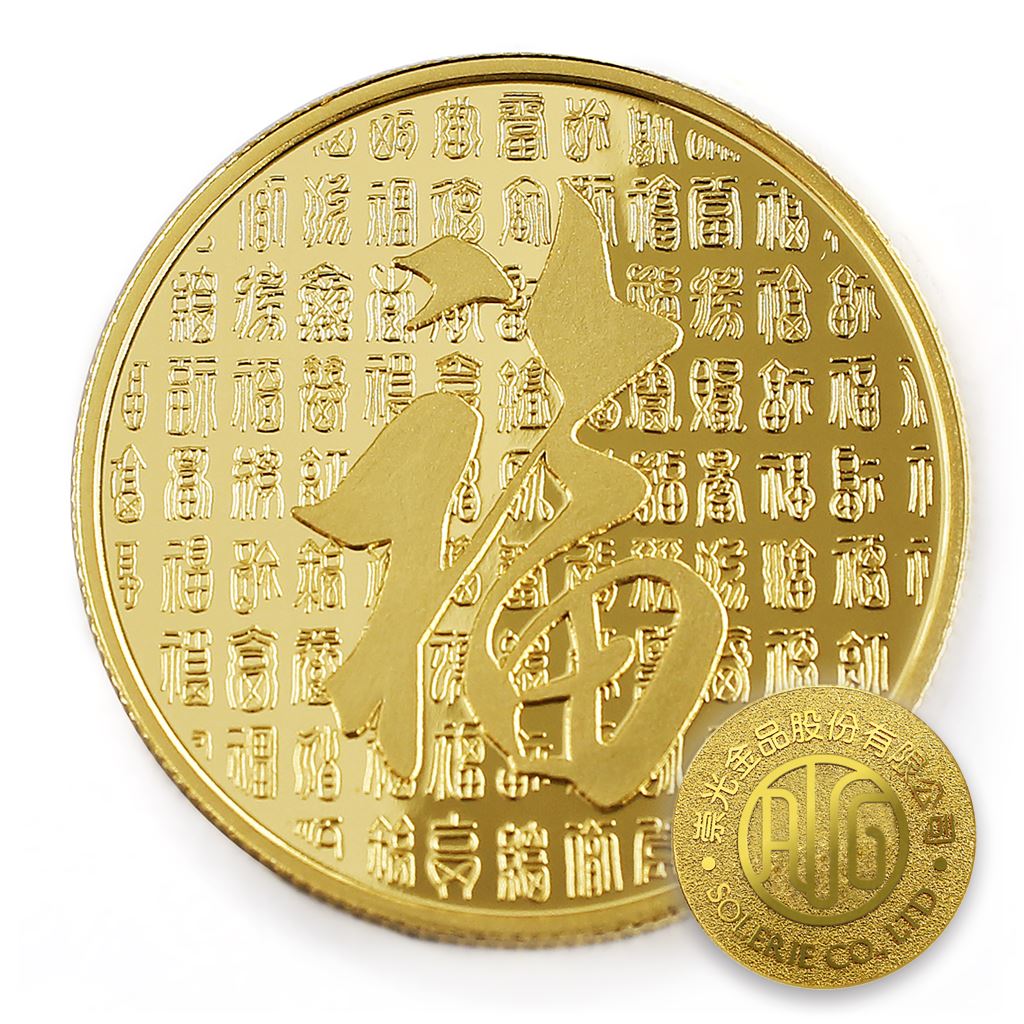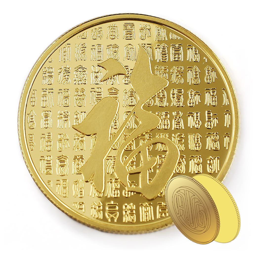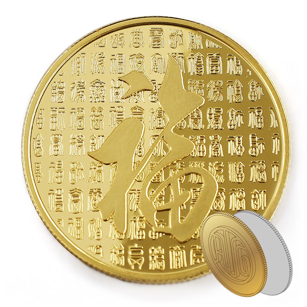 正面為金幣百福圖樣,背面為銅鍍金材質鏡面客製化CNC雕刻