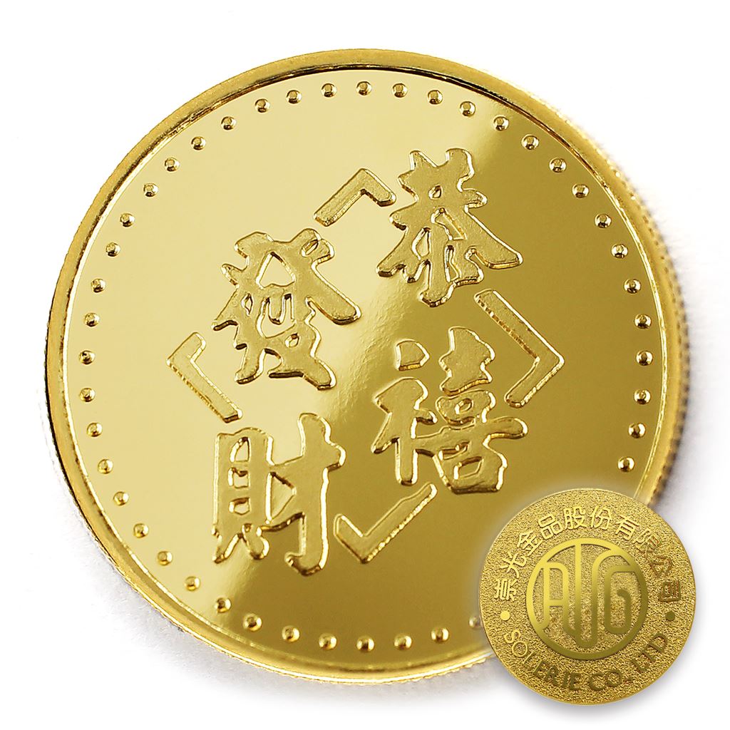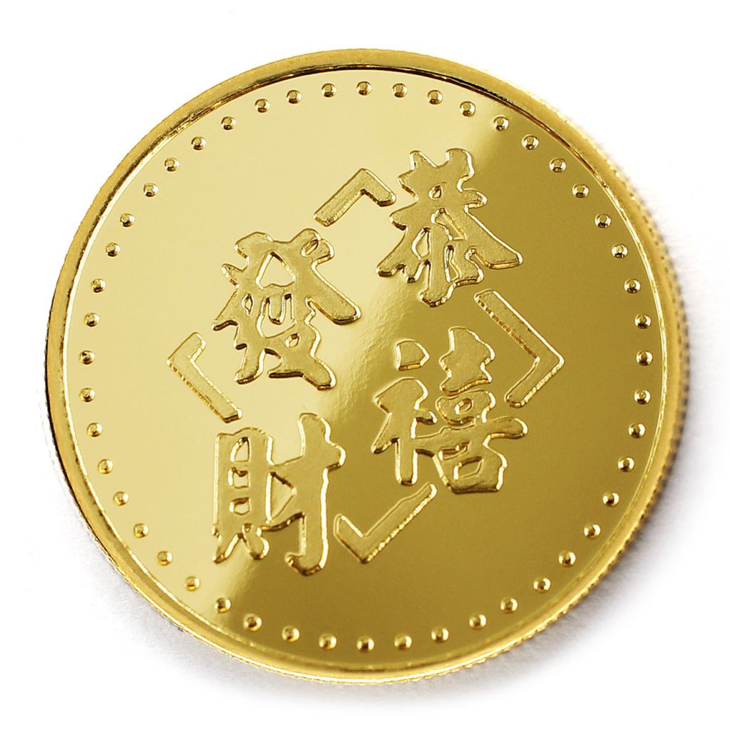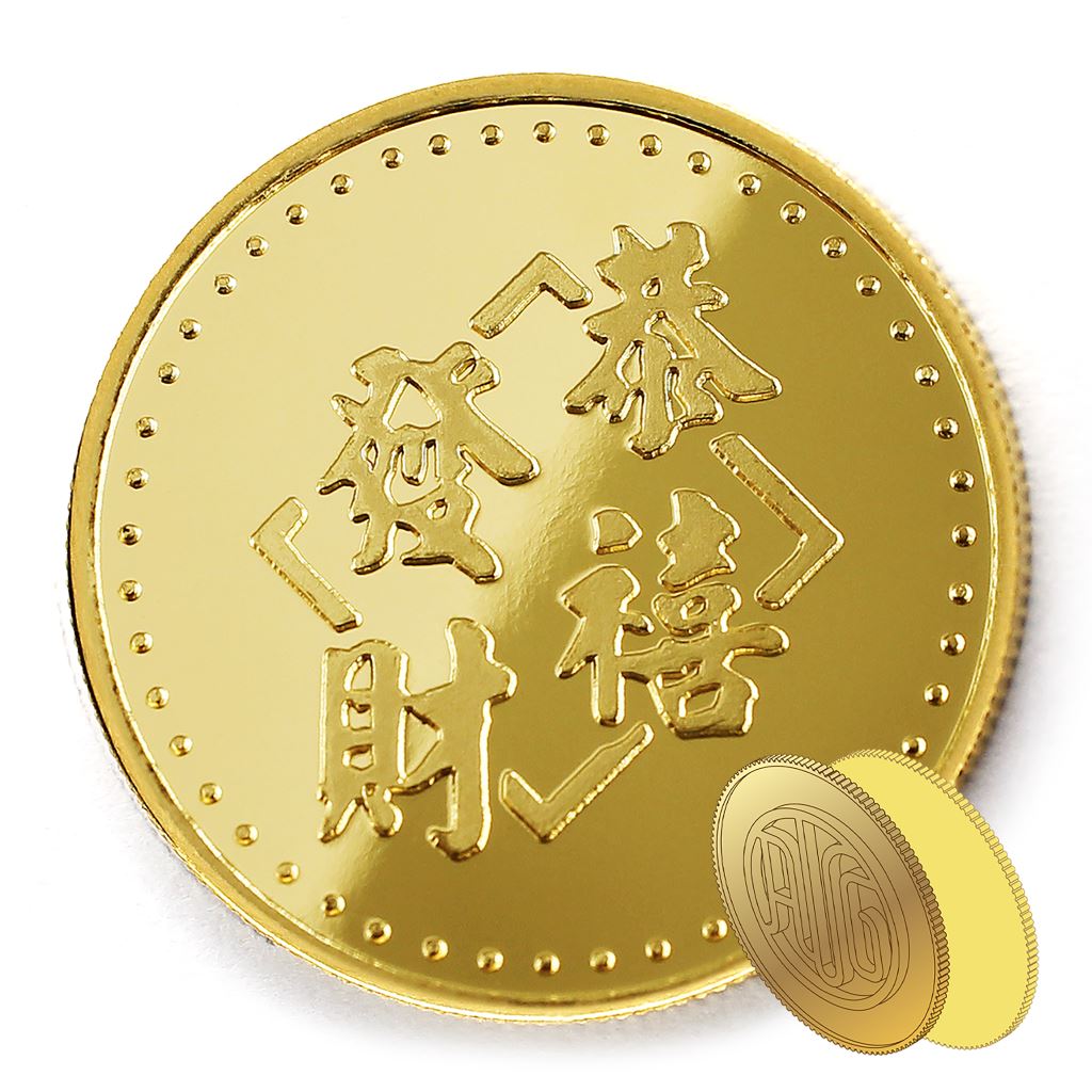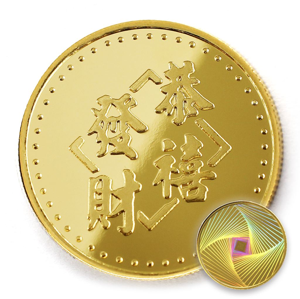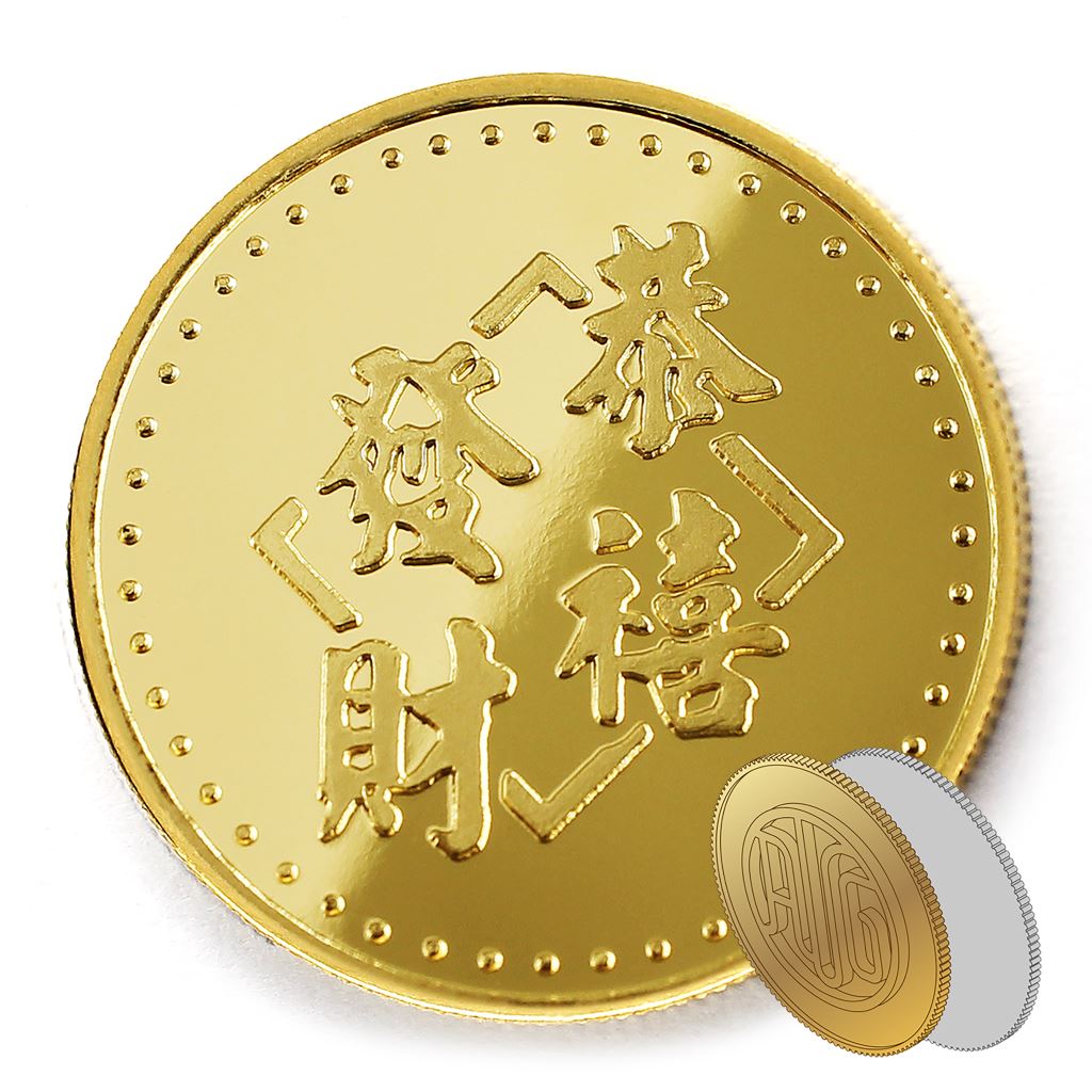 正面為金幣恭喜發財圖樣,背面為銅鍍金材質鏡面客製化CNC雕刻