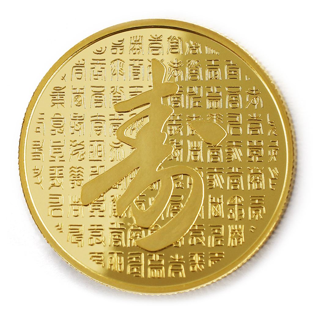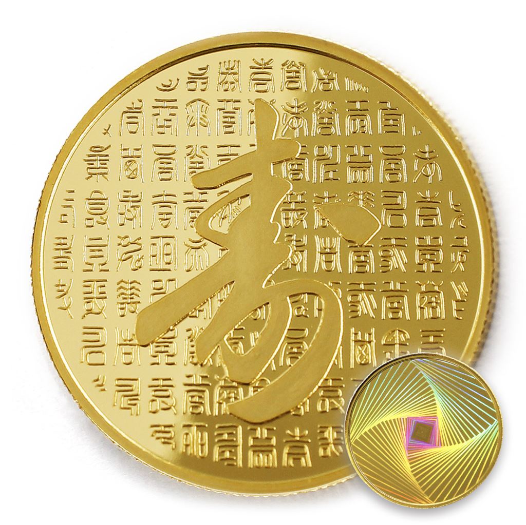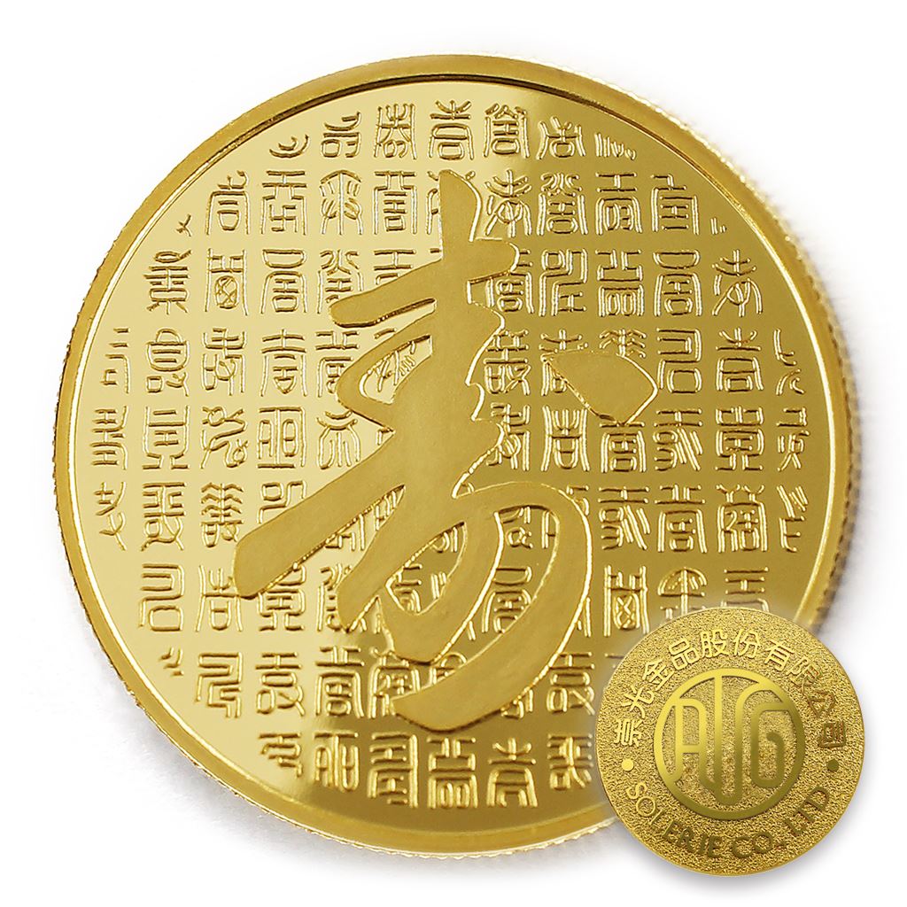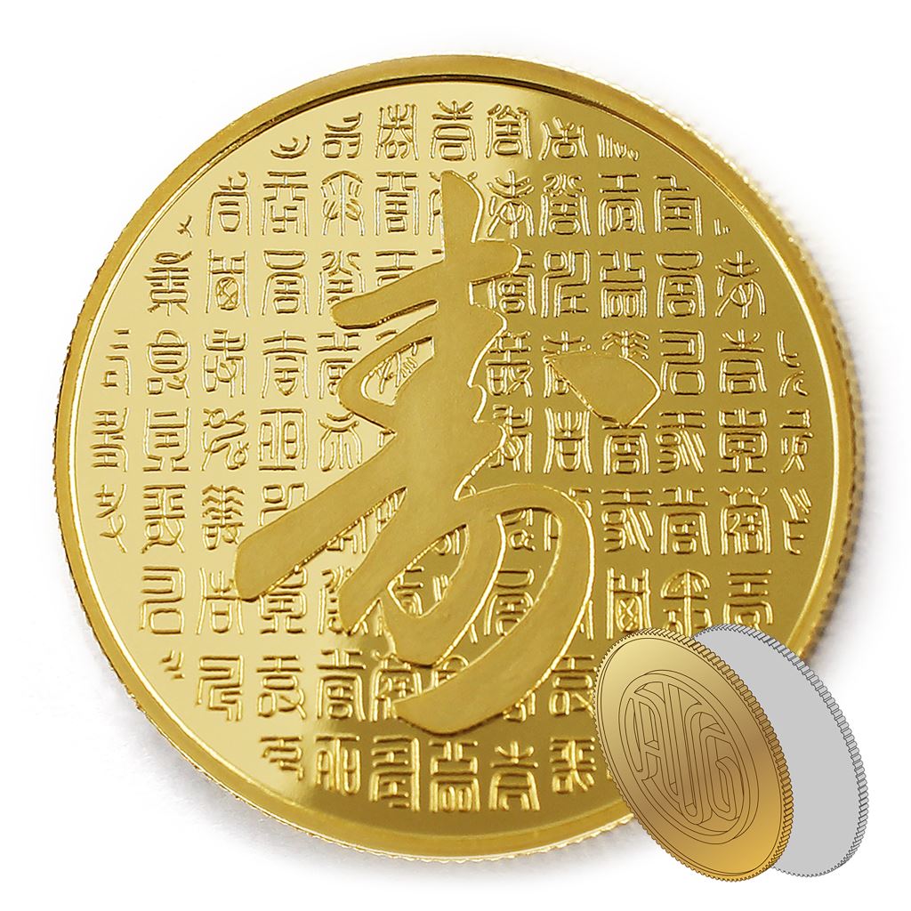 正面為金幣百壽圖樣,背面為銅鍍金材質鏡面客製化CNC雕刻