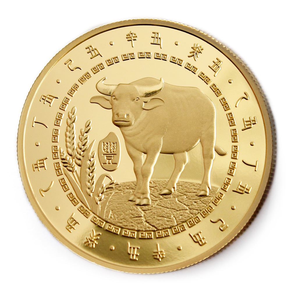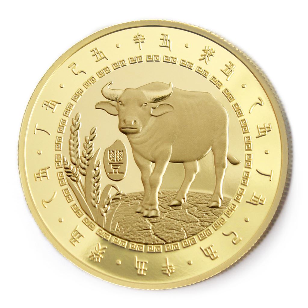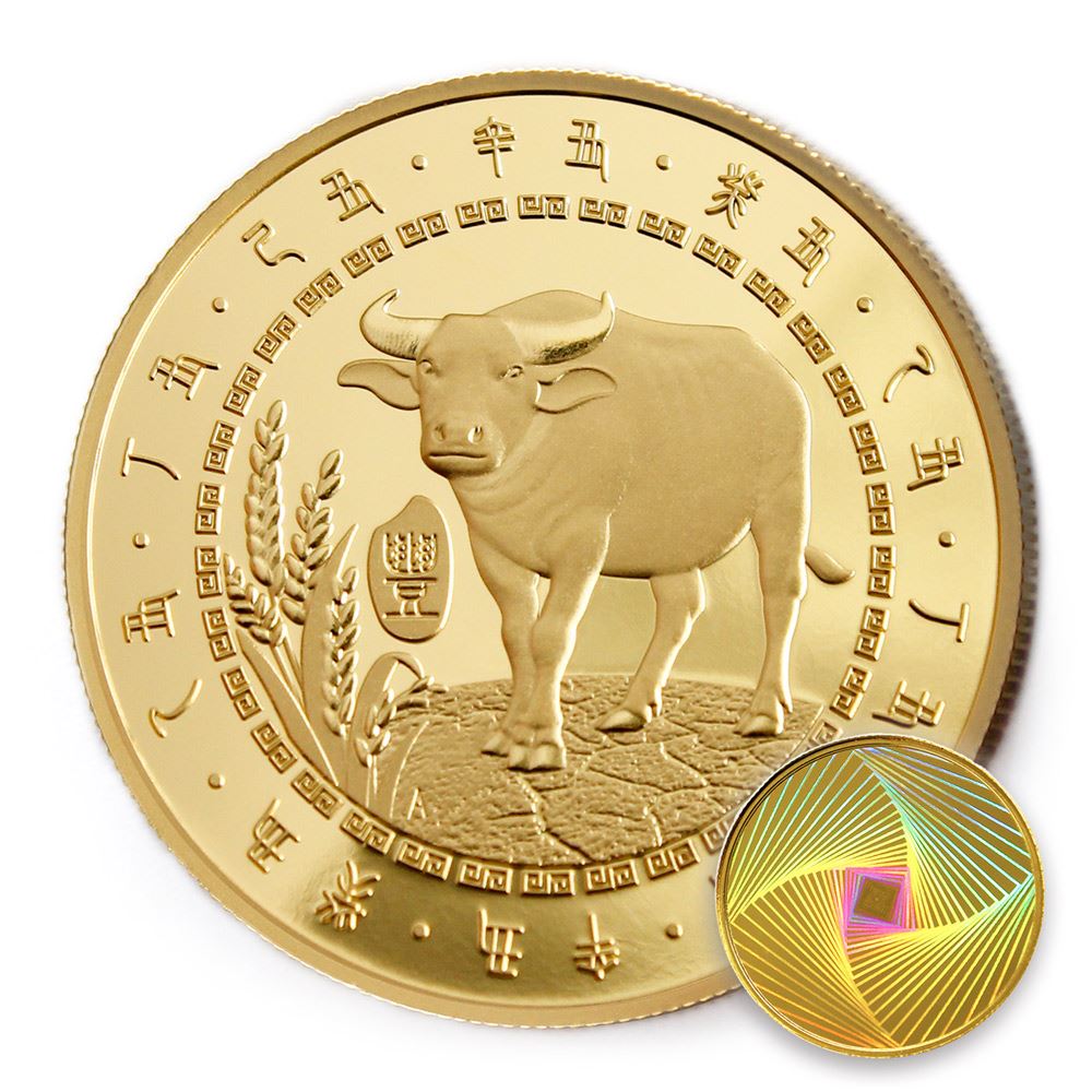正面為金幣牛年生肖圖樣,背面為銅鍍金材質鏡面客製化CNC雕刻