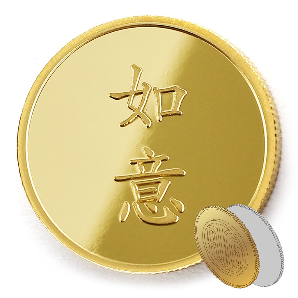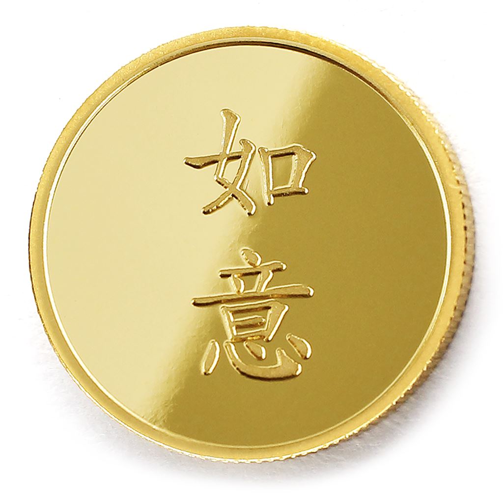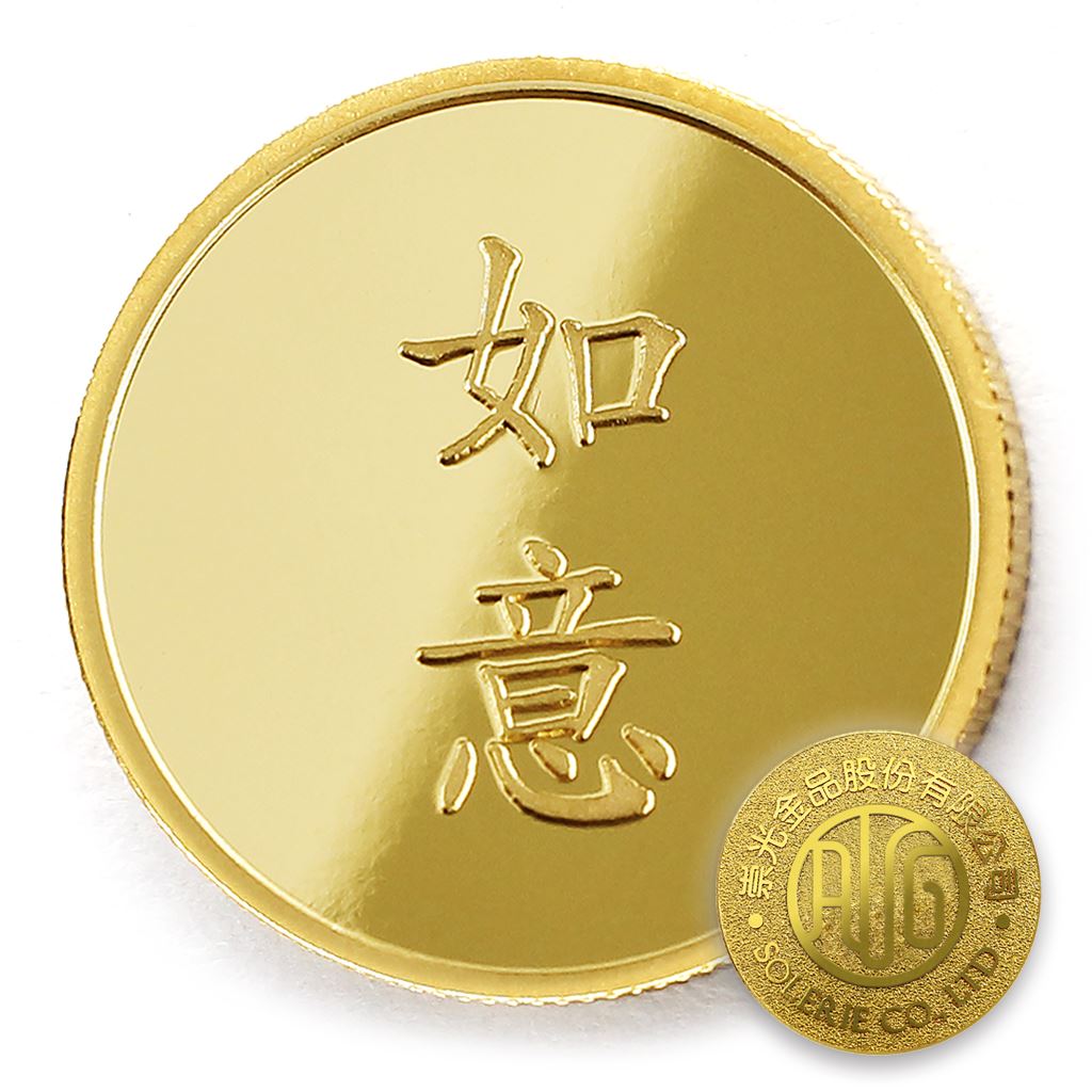 正面為金幣如意圖樣,背面為銅鍍金材質鏡面客製化CNC雕刻