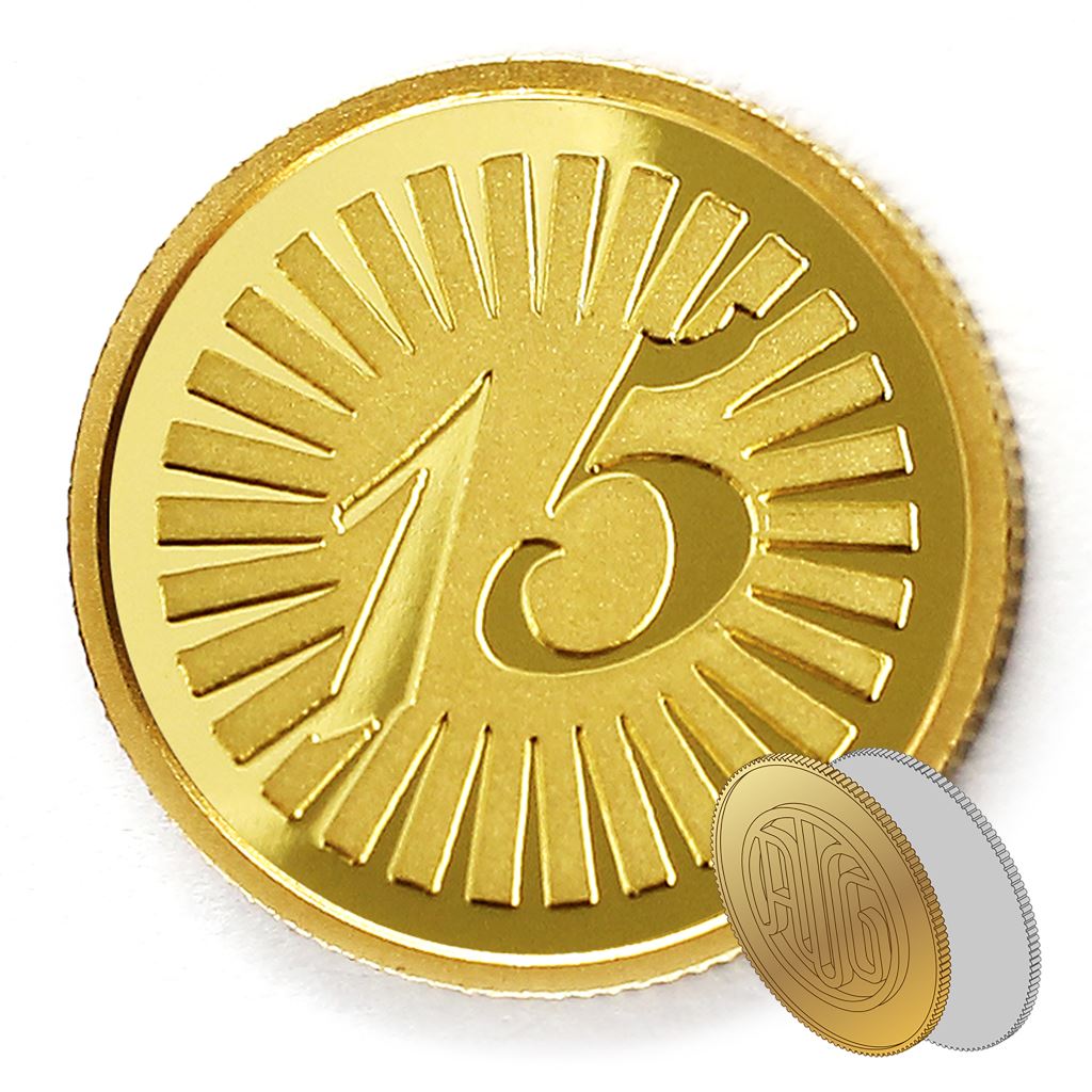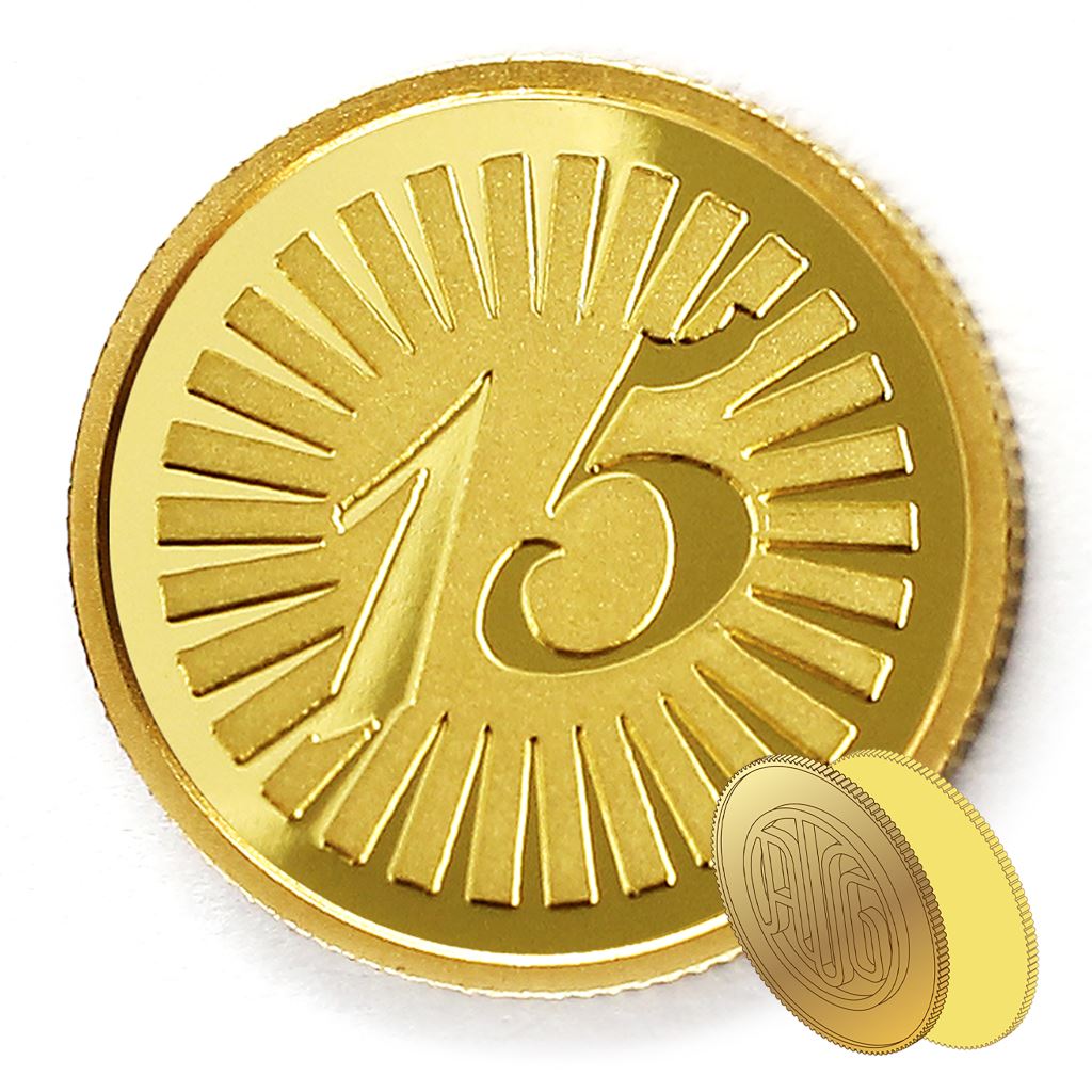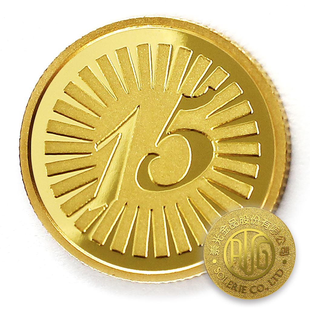 正面為金幣年資15光芒圖樣,背面為銅鍍金材質鏡面客製化CNC雕刻