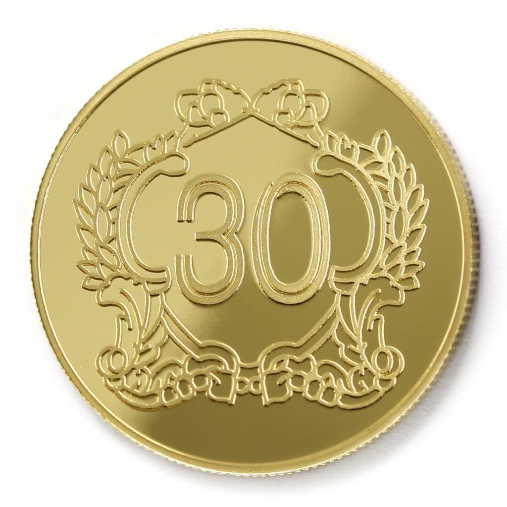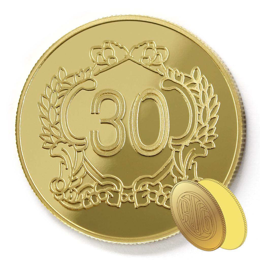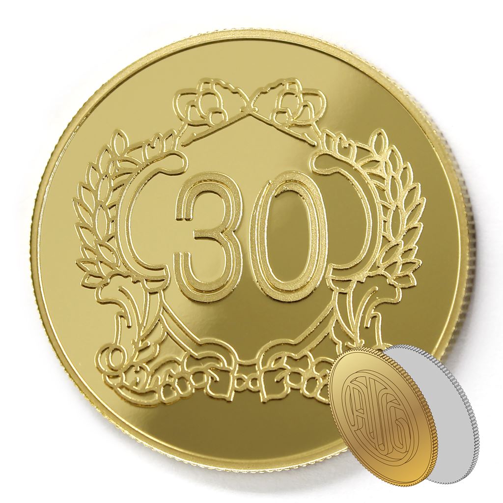 正面為金幣年資30桂環圖樣,背面為銅鍍金材質鏡面客製化CNC雕刻