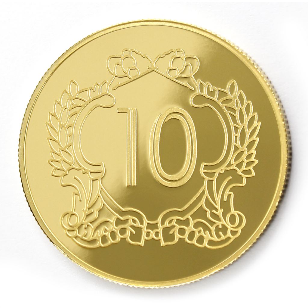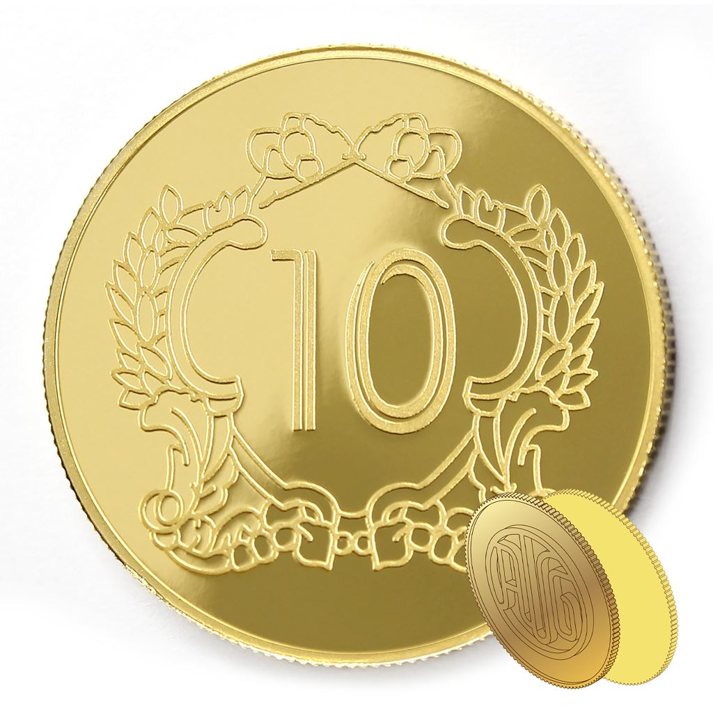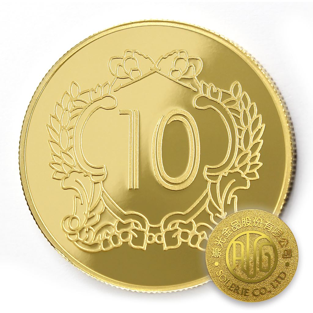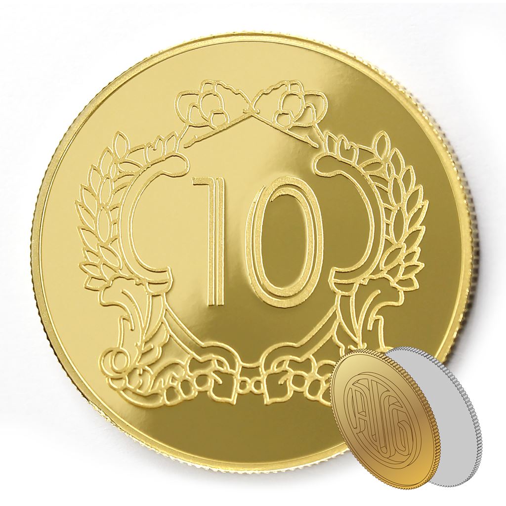 正面為金幣年資10榮耀圖樣,背面為銅鍍金材質鏡面客製化CNC雕刻