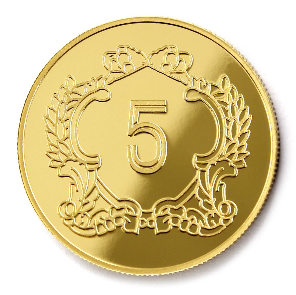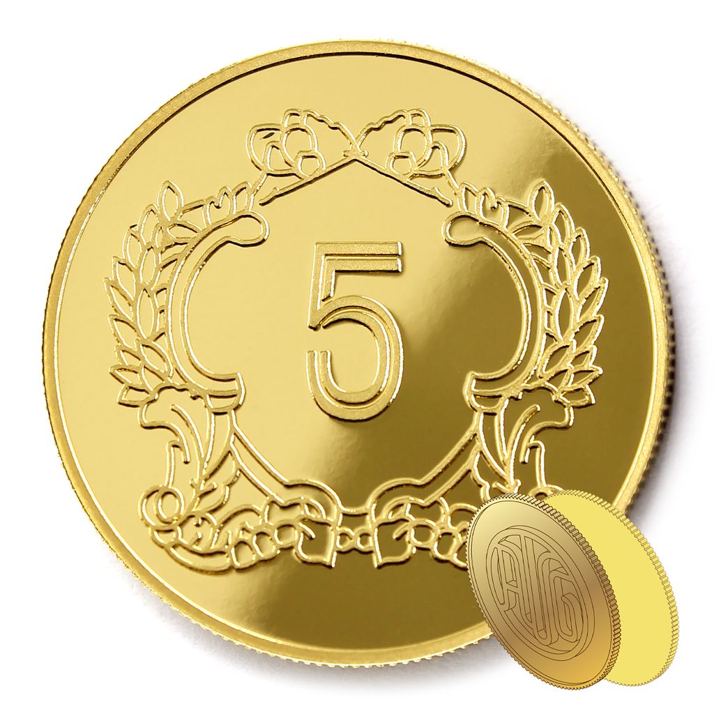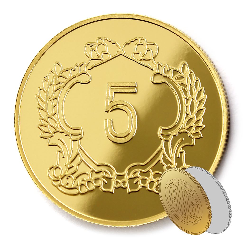 正面為金幣年資5榮耀圖樣,背面為銅鍍金材質鏡面客製化CNC雕刻
