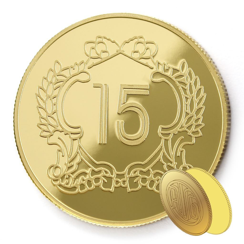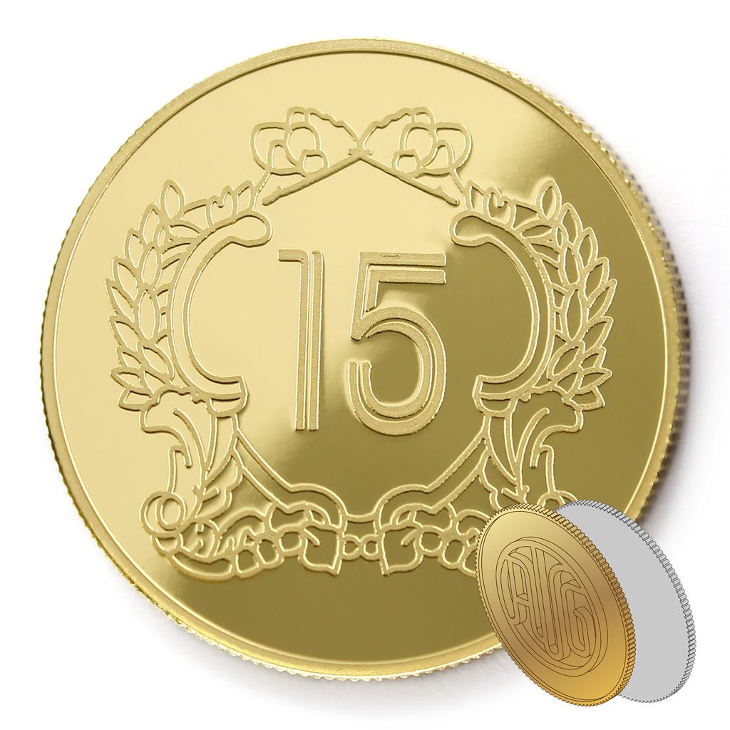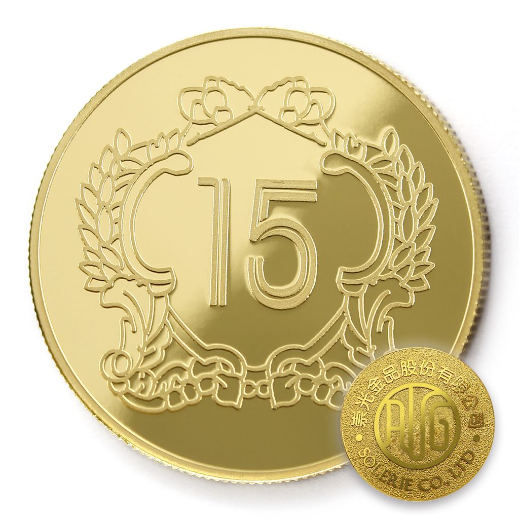 正面為金幣年資15榮耀圖樣,背面為銅鍍金材質鏡面客製化CNC雕刻