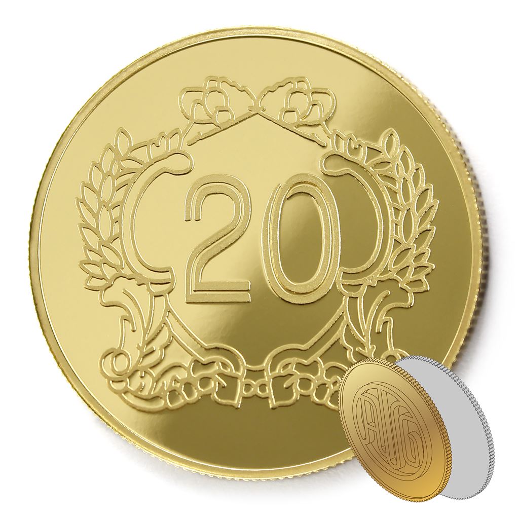 正面為金幣年資20榮耀圖樣,背面為銅鍍金材質鏡面客製化CNC雕刻