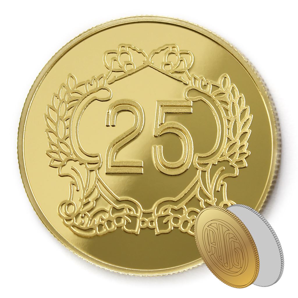 正面為金幣年資25榮耀圖樣,背面為銅鍍金材質鏡面客製化CNC雕刻