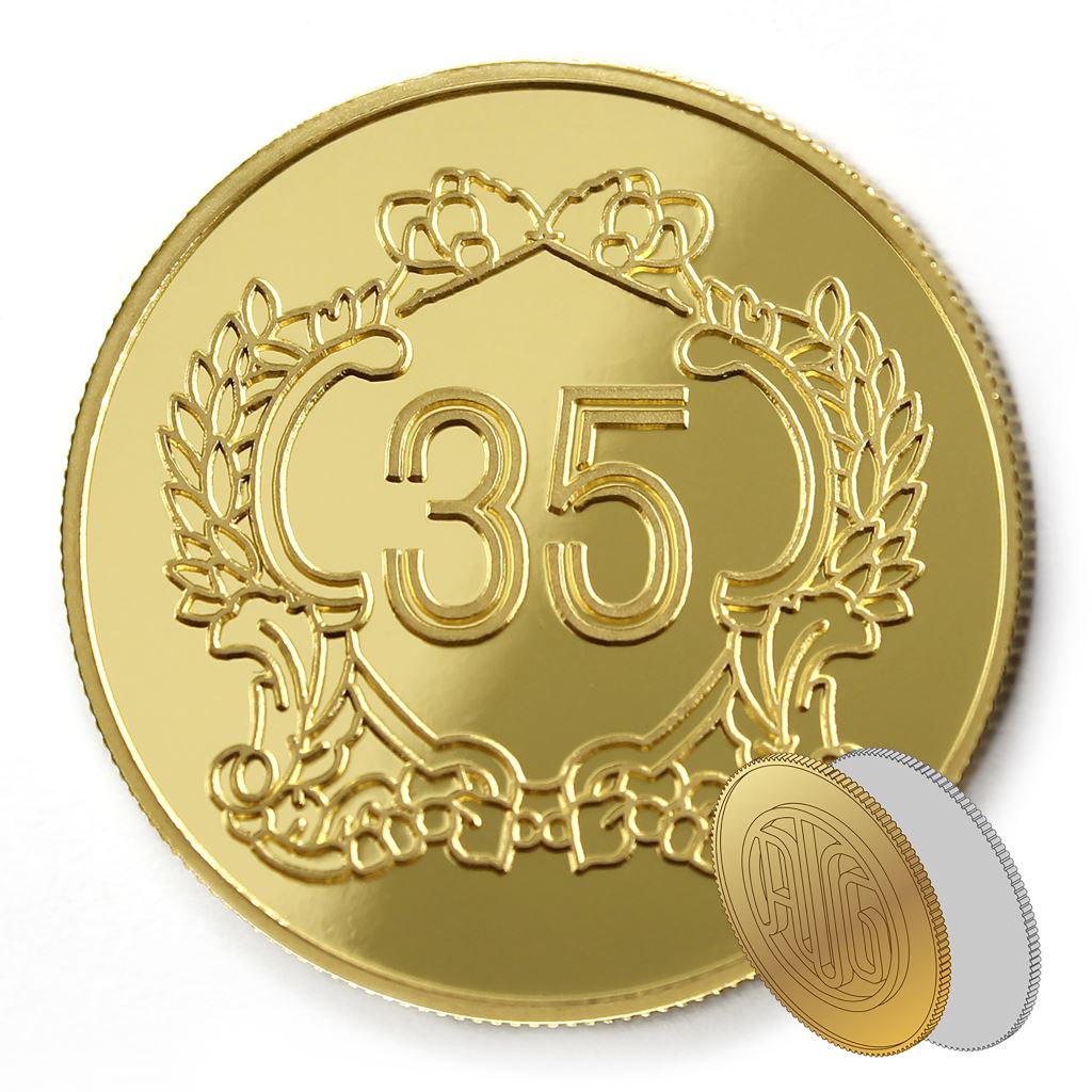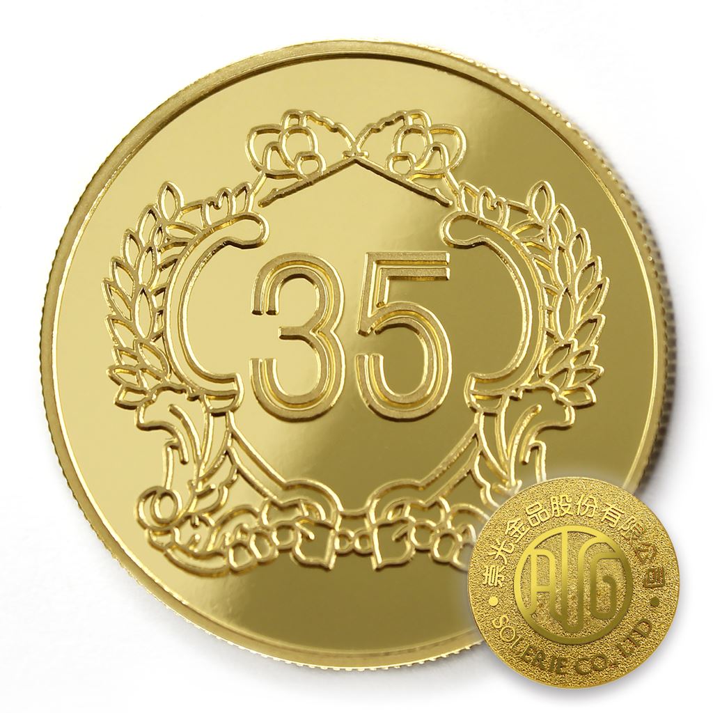正面為金幣年資35榮耀圖樣,背面為銅鍍金材質鏡面客製化CNC雕刻