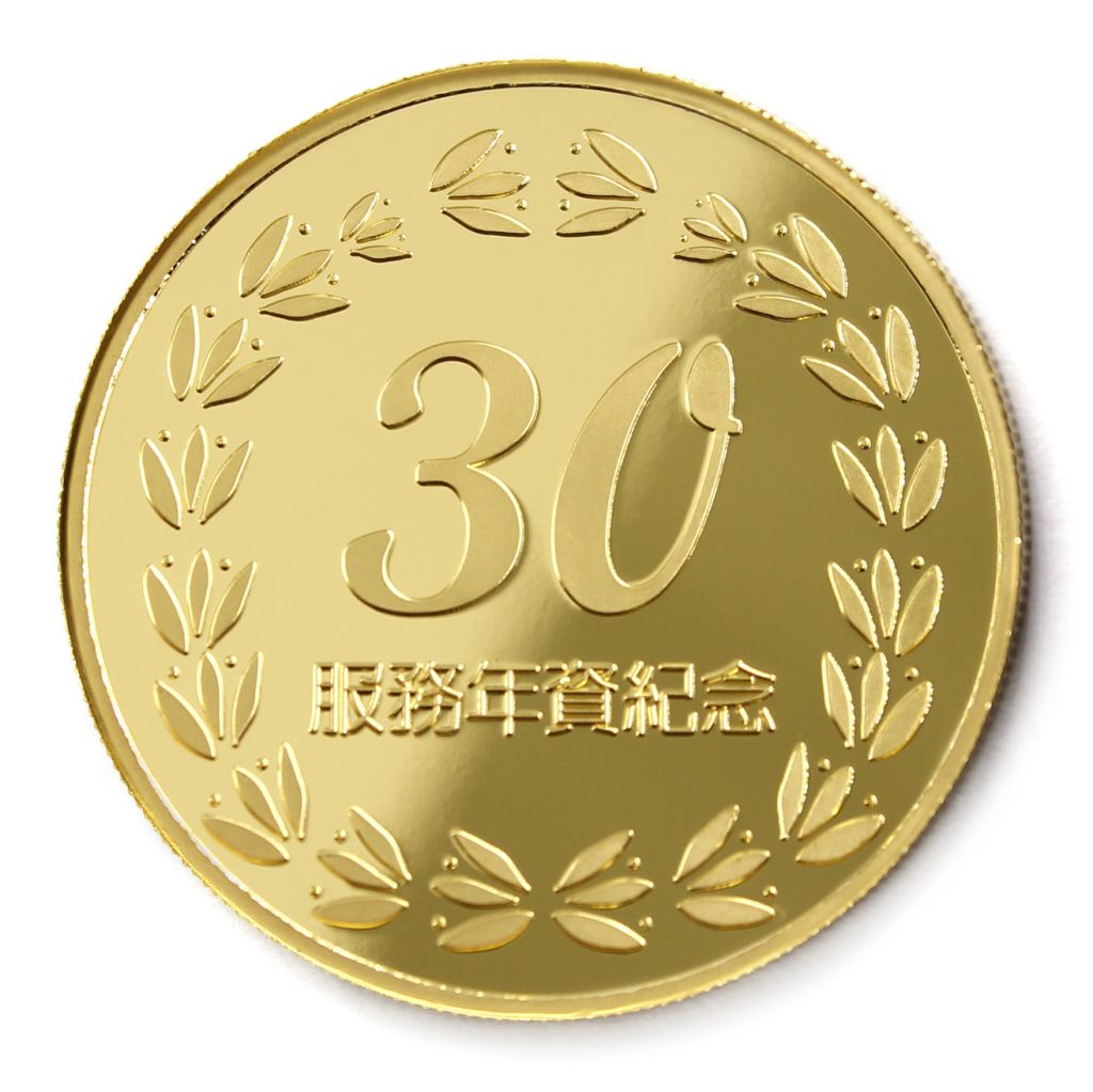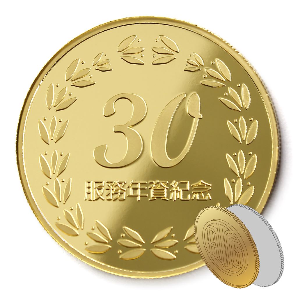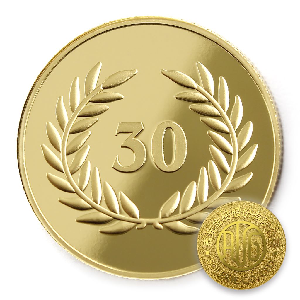 正面為金幣年資30月桂圖樣,背面為銅鍍金材質鏡面客製化CNC雕刻