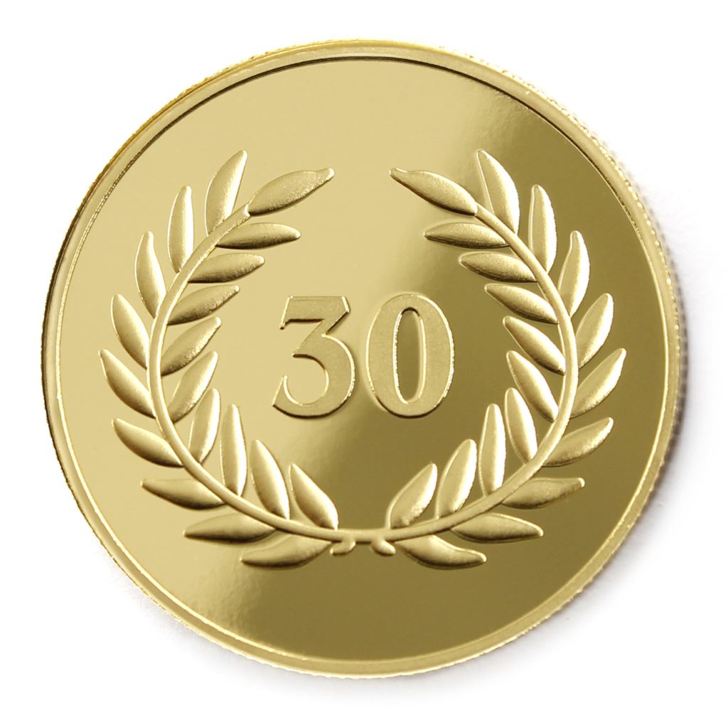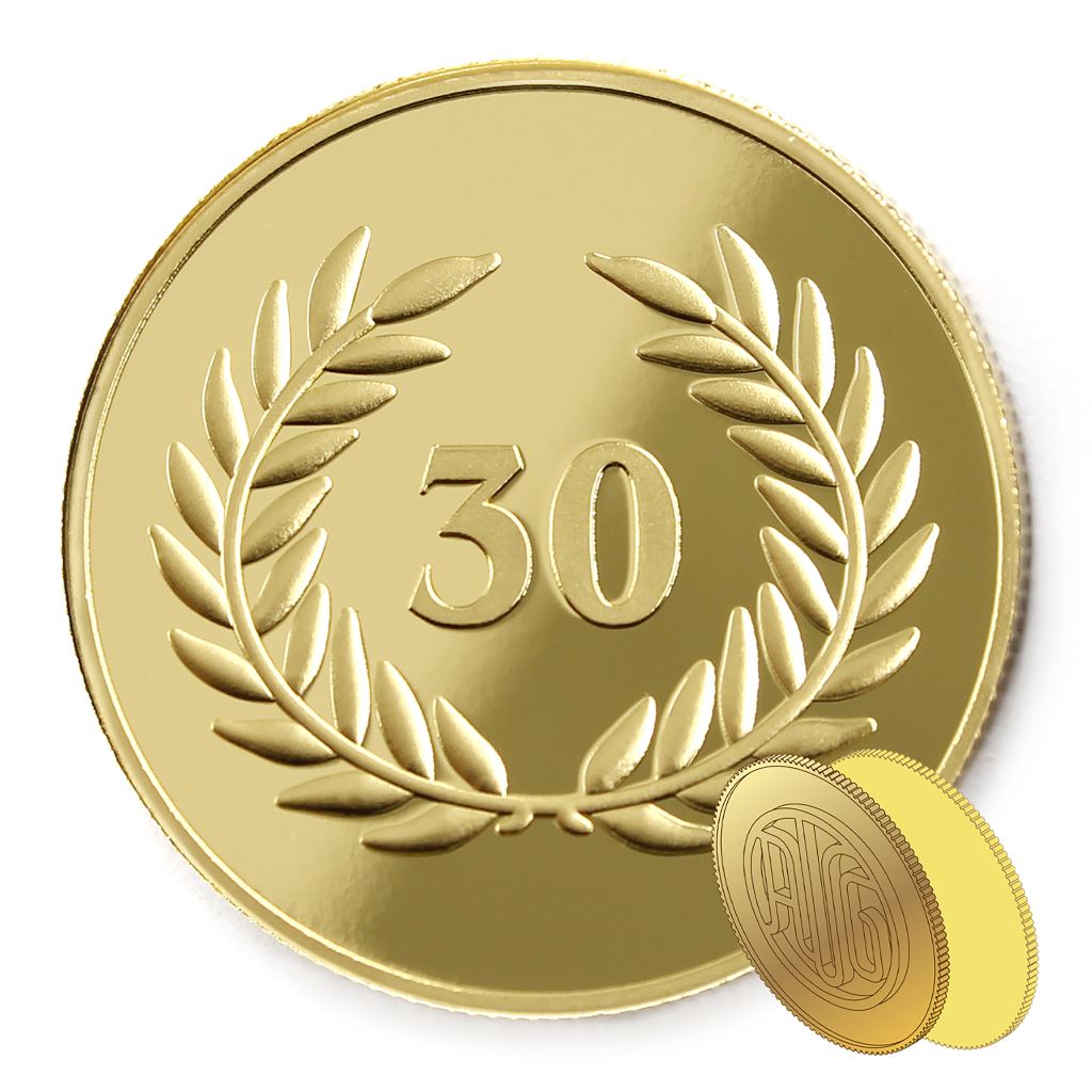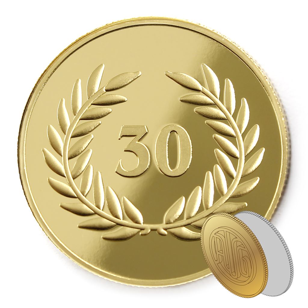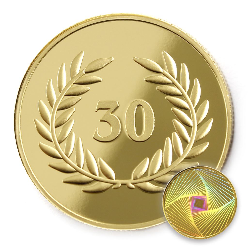 正面為金幣年資30月桂圖樣,背面為銅鍍金材質鏡面客製化CNC雕刻