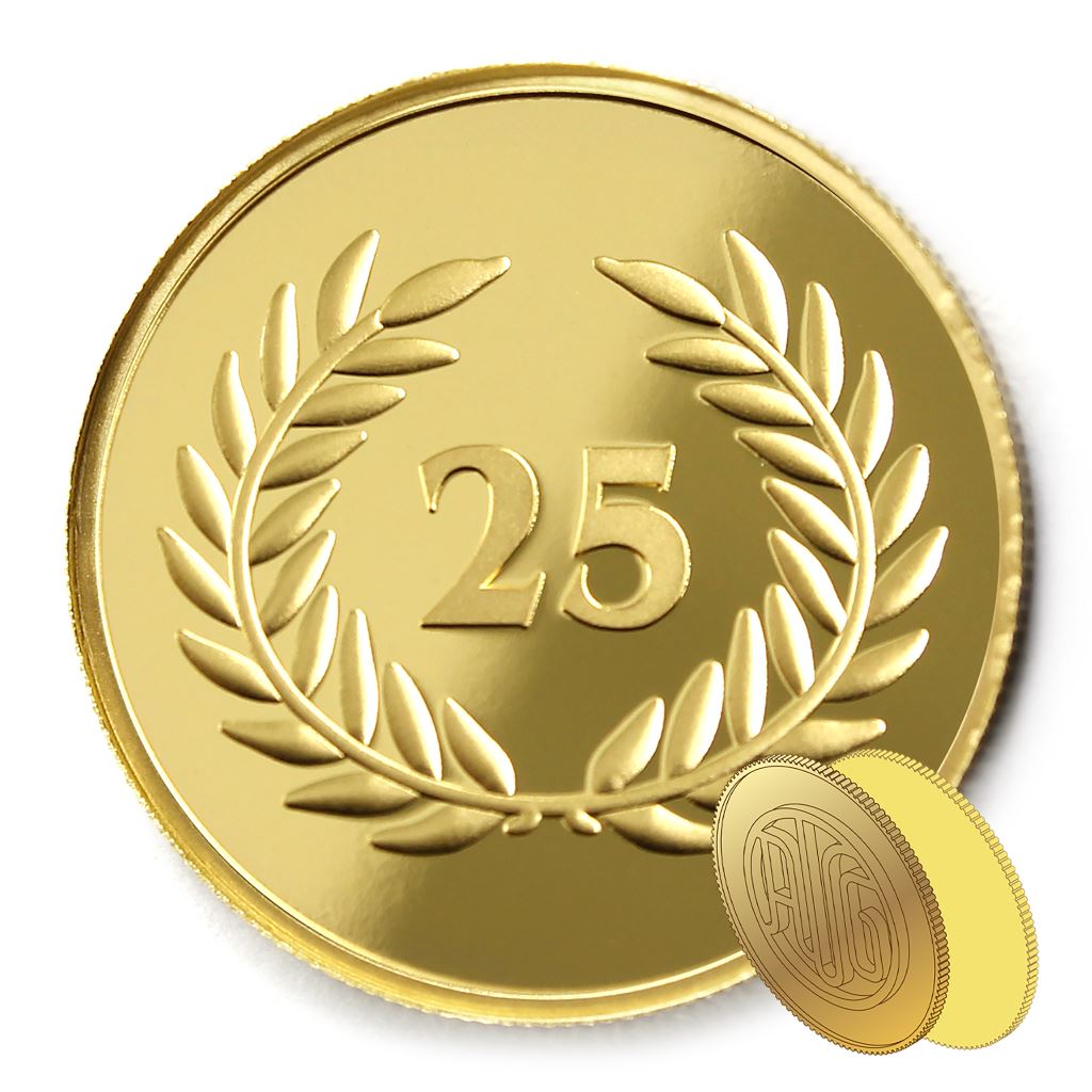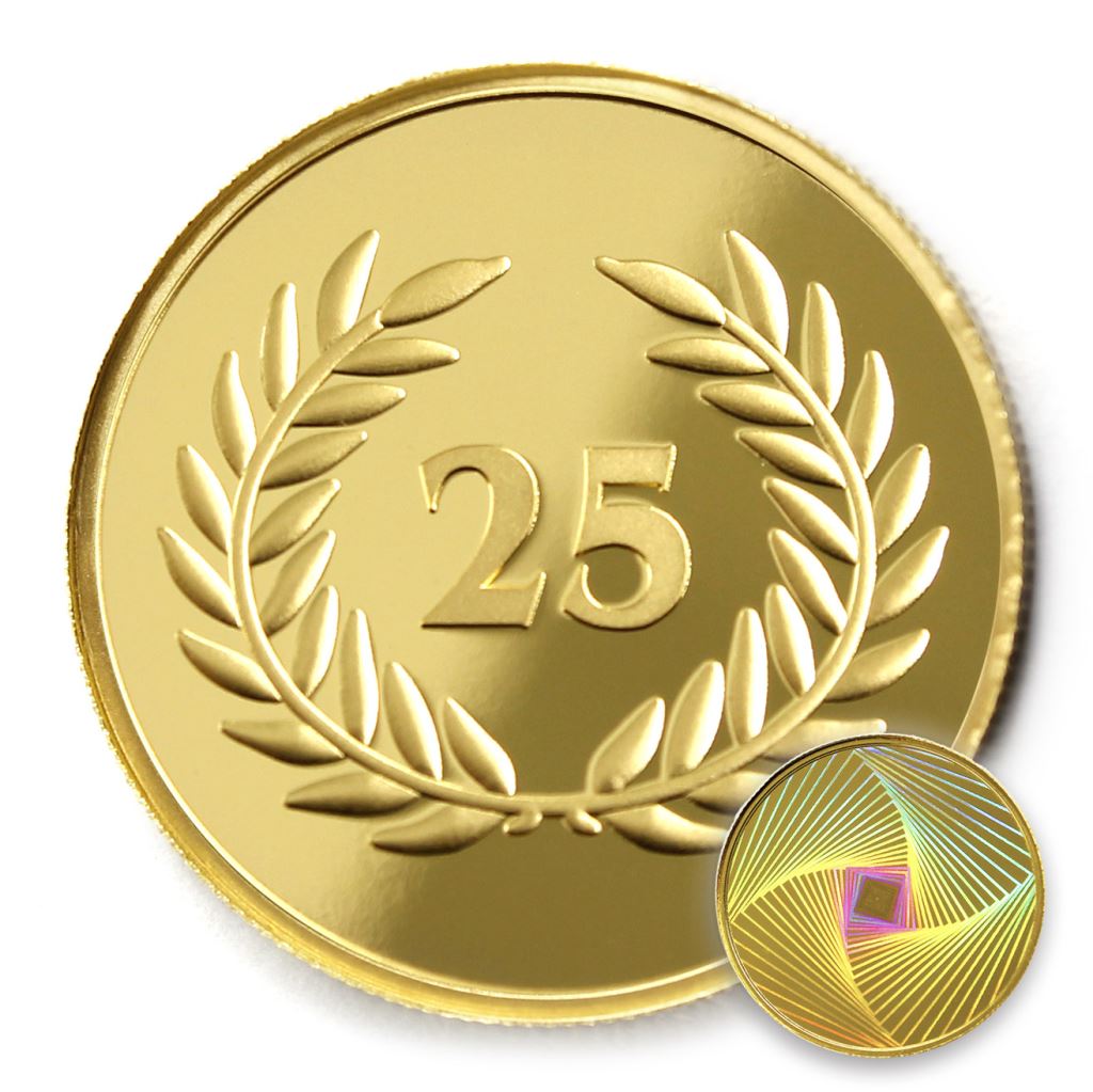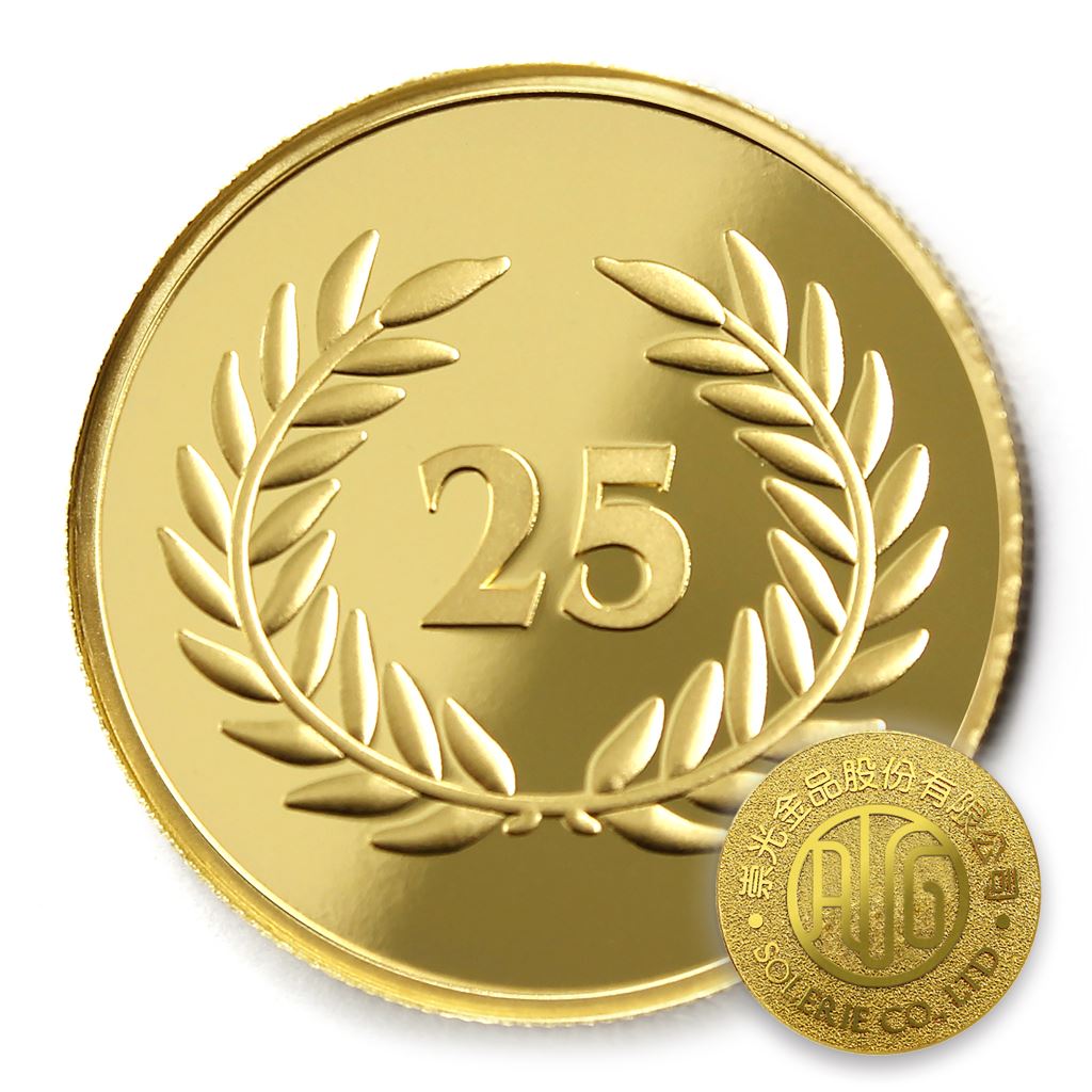 正面為金幣年資25月桂圖樣,背面為銅鍍金材質鏡面客製化CNC雕刻