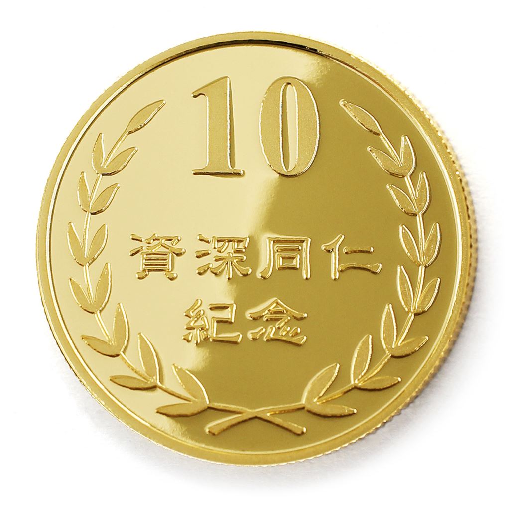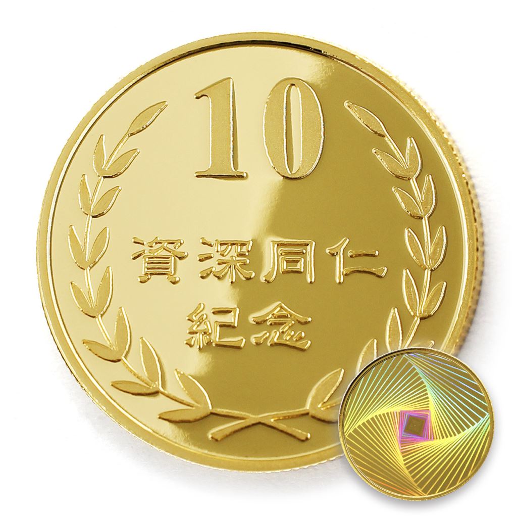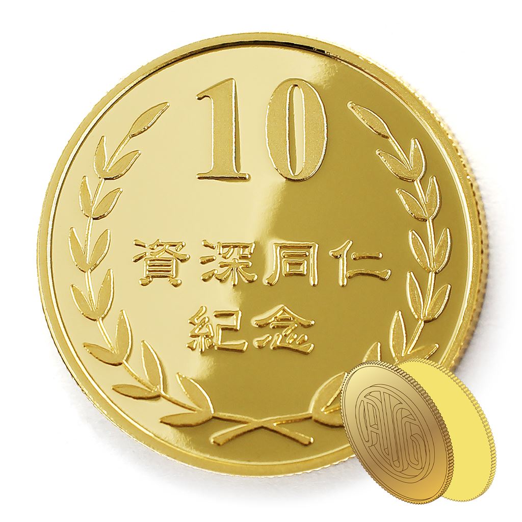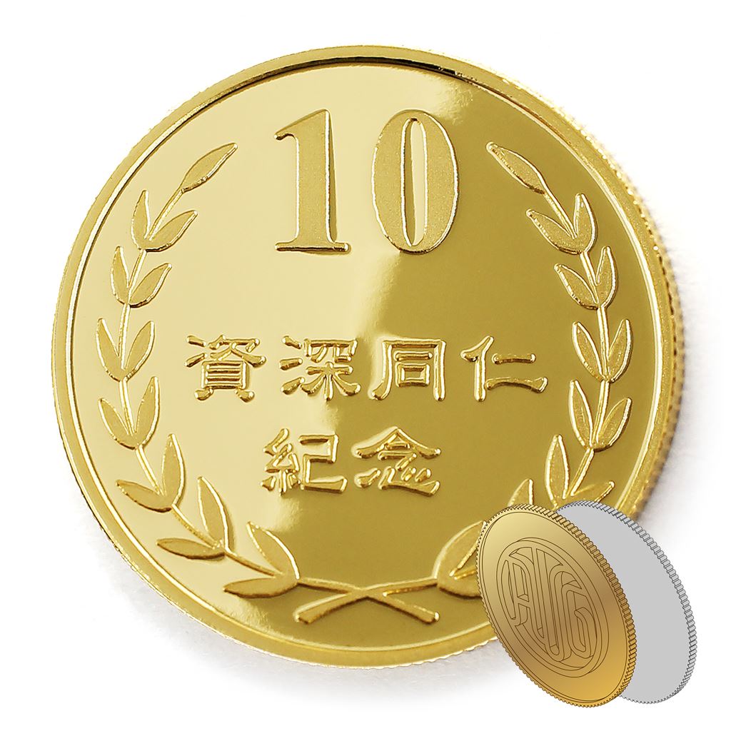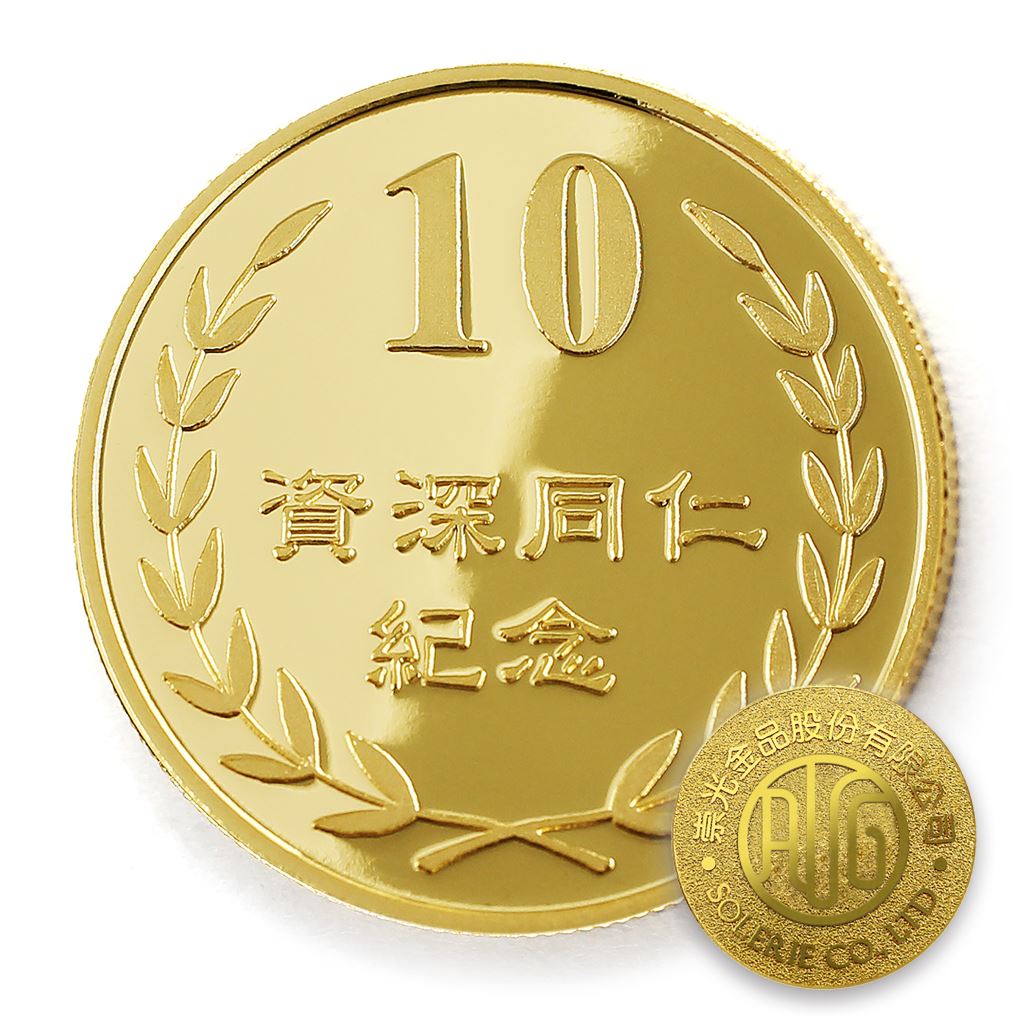 正面為金幣年資10桂冠圖樣,背面為銅鍍金材質鏡面客製化CNC雕刻