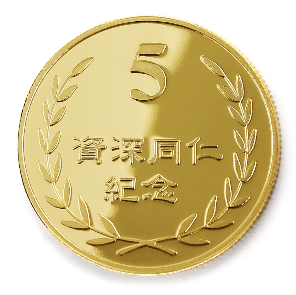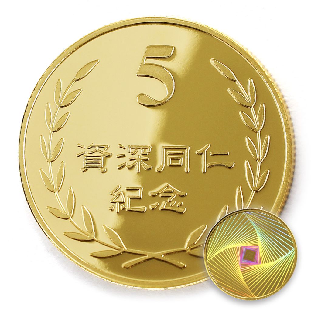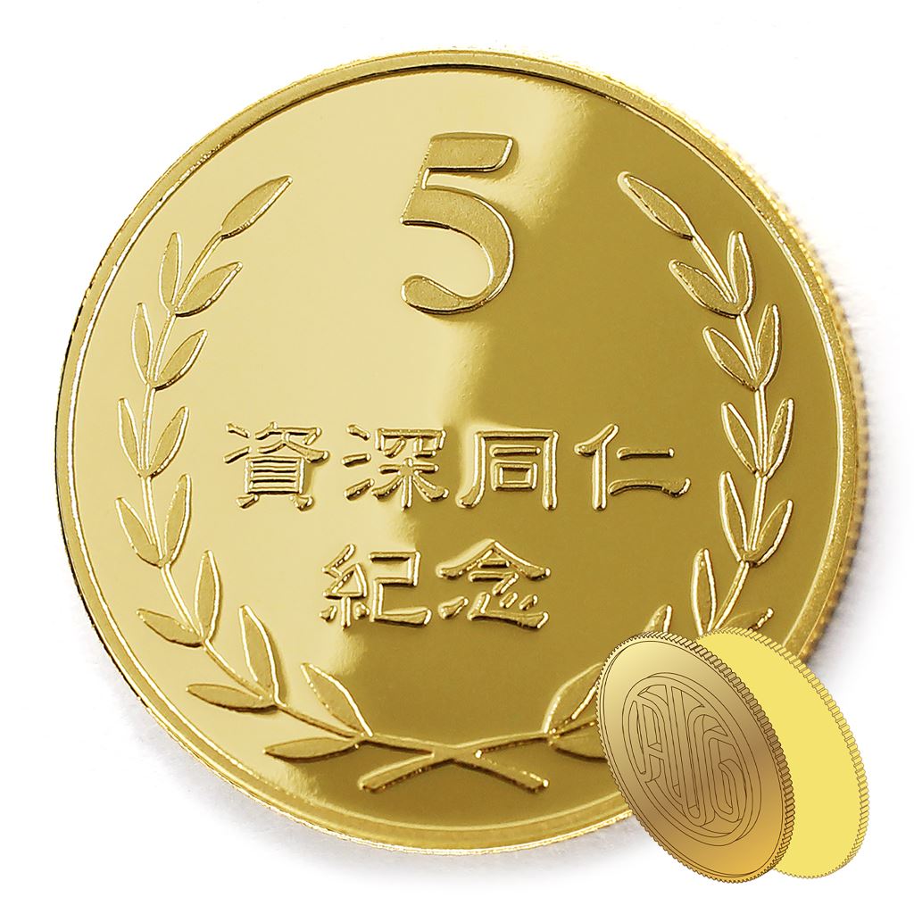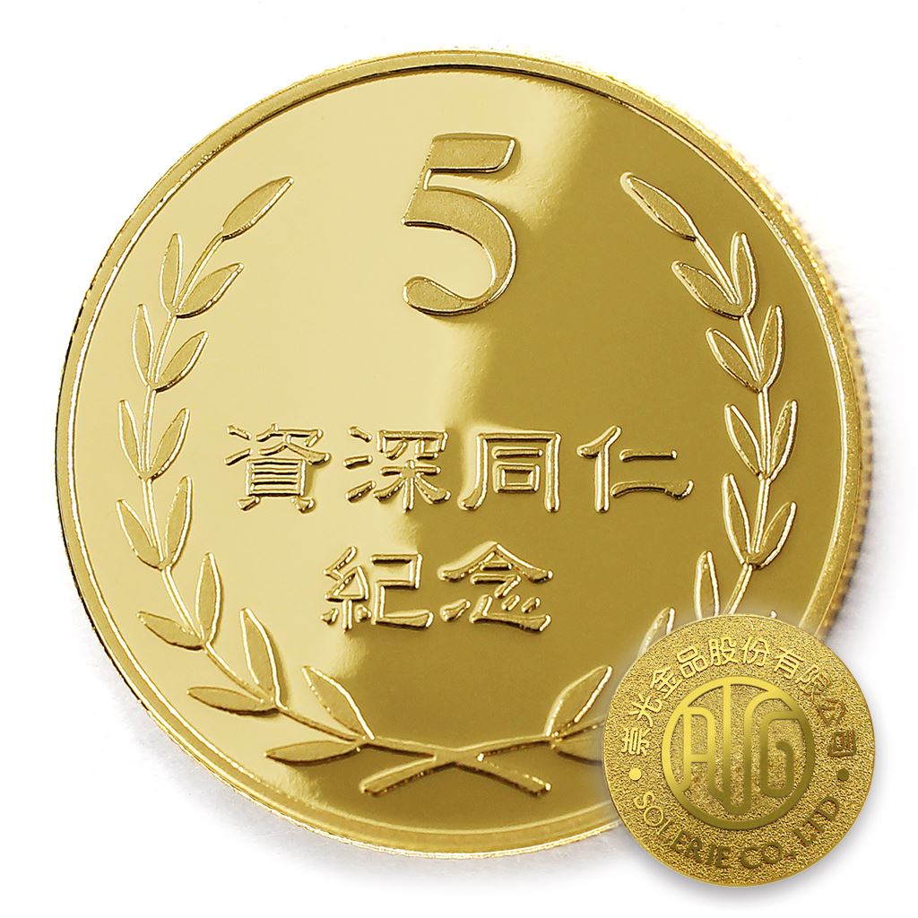 正面為金幣年資5桂冠圖樣,背面為銅鍍金材質鏡面客製化CNC雕刻