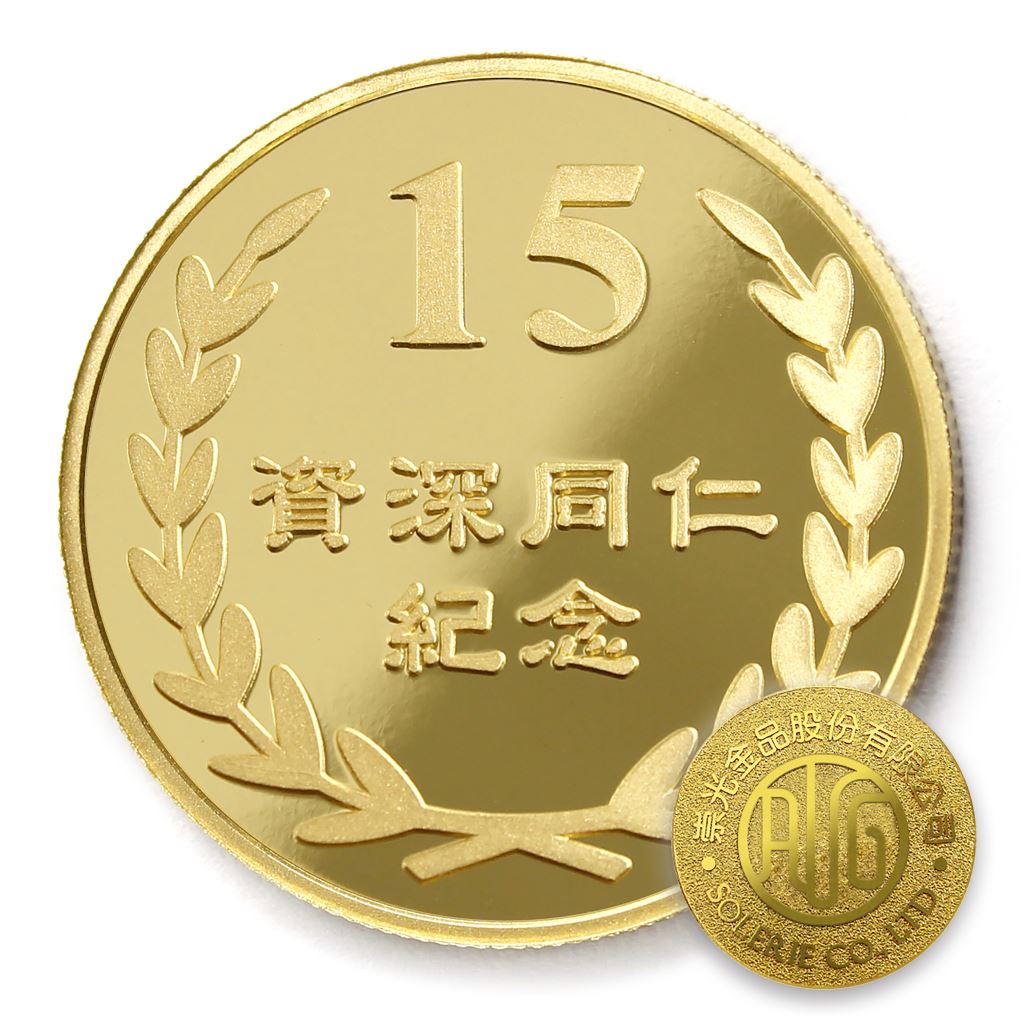正面為金幣年資15桂冠圖樣,背面為銀幣鏡面客製化CNC雕刻