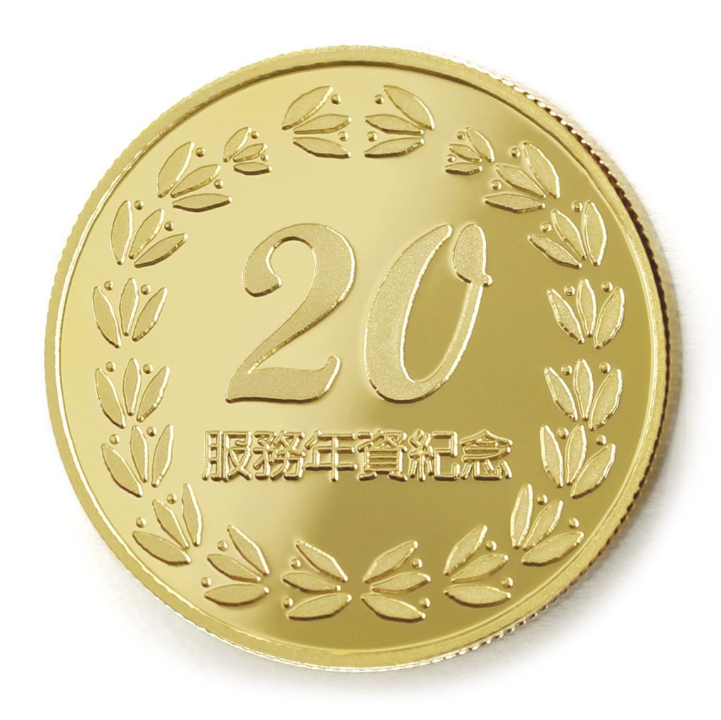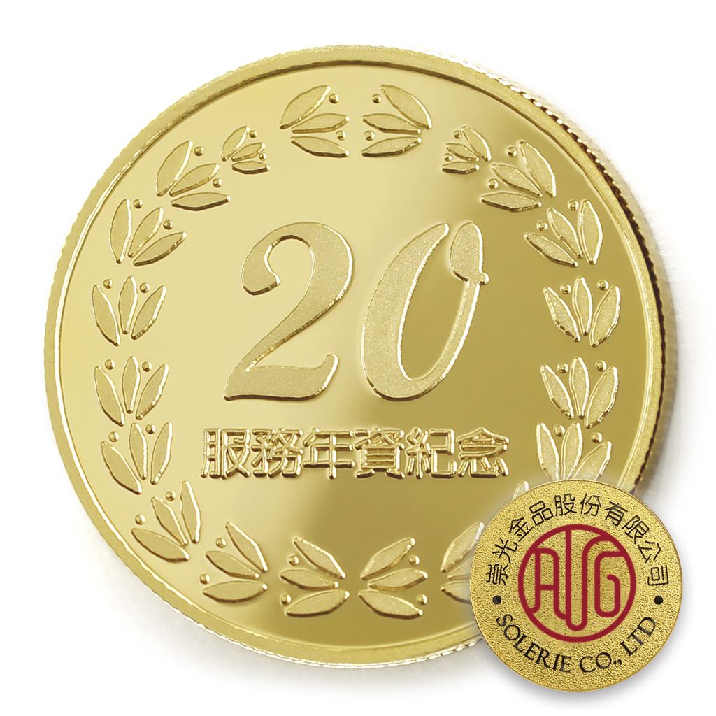 正面為年資20月桂圖樣,背面貼覆客製化金箔