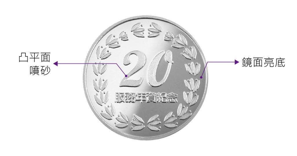1.客製幣面區域可依客戶用途及需求,雕刻圖像與文案,雕刻效果為單線字體 或 描繪外框的中空字體,因雕刻為破壞性方式,仿實心字體需反覆刻畫,會產生粗糙的毛邊,故不建議使用。